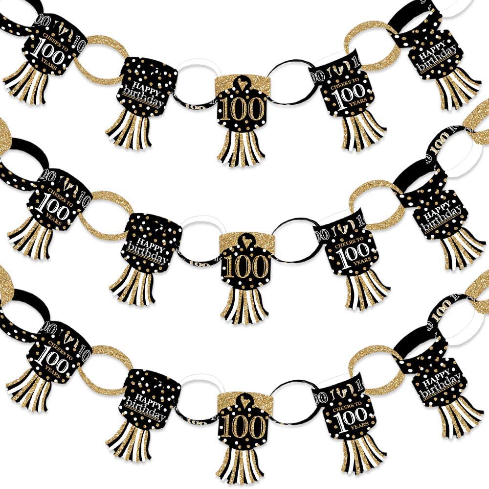 Adult 100th Birthday - Gold - 90 Chain Links and 30 Paper Tassels Decoration Kit - Birthday Party Paper Chains Garland - 21 feet