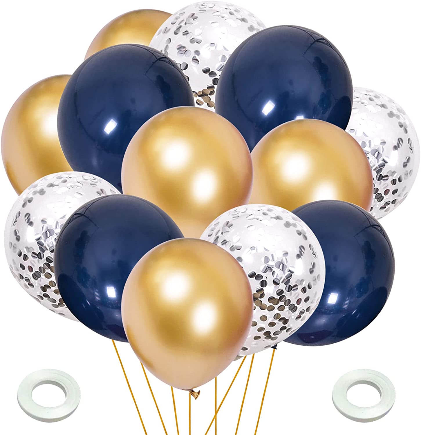 Dark Blue, Gold & Silver Confetti Bouquet, 12 Balloons, With helium is backordered and will ship as soon as it is back in stock.