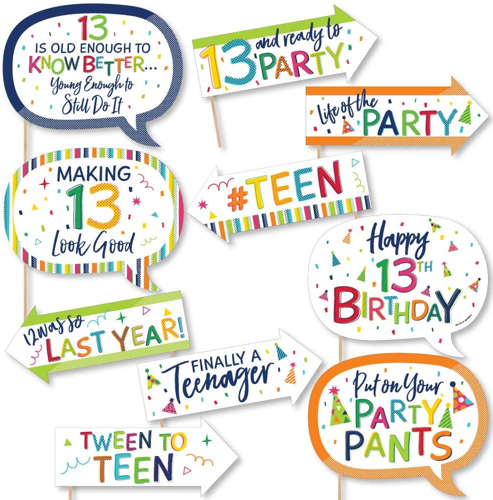 Funny 13th Birthday - Cheerful Happy Birthday - Colorful Thirteenth Birthday Party Photo Booth Props Kit - 10 Piece