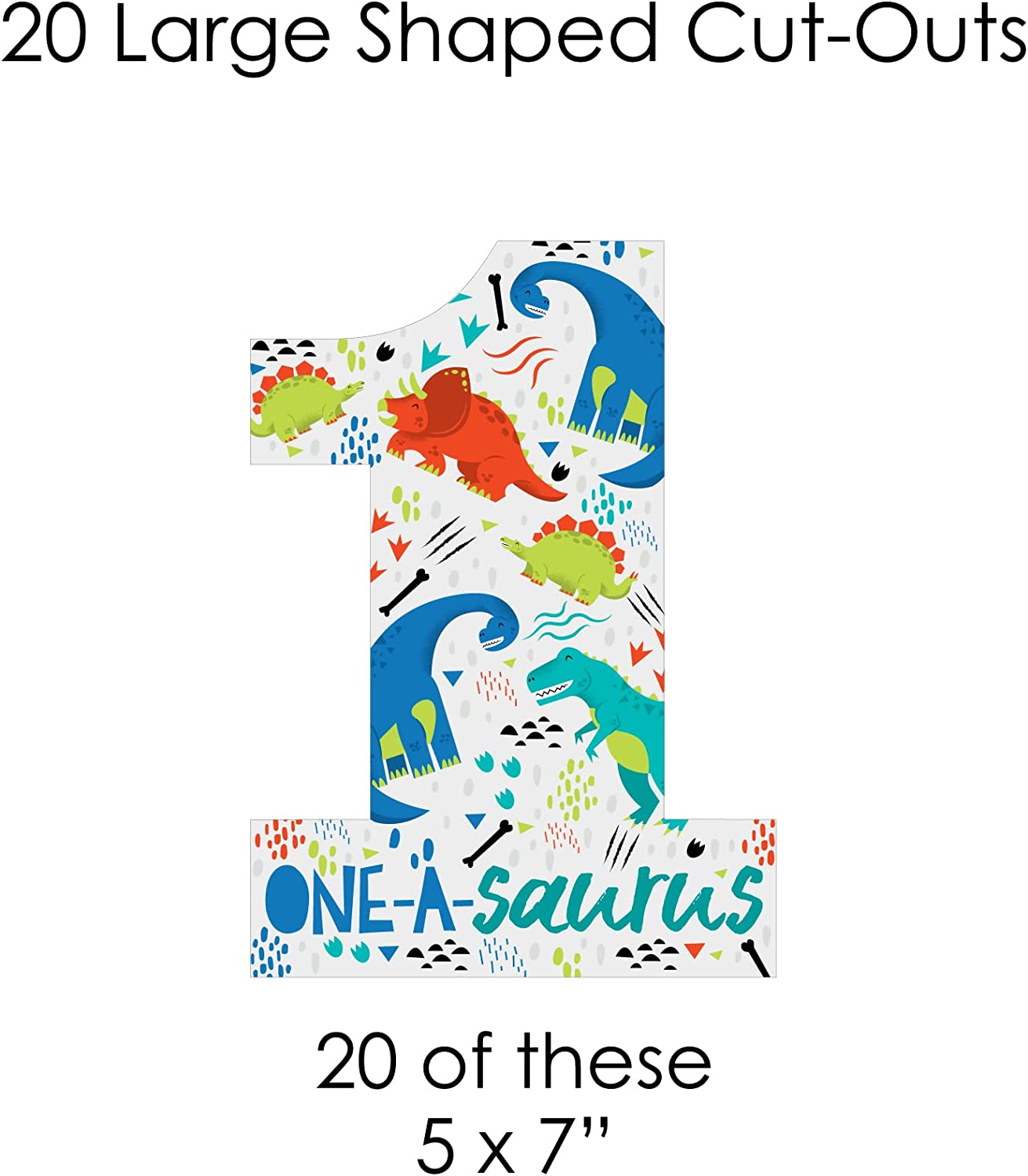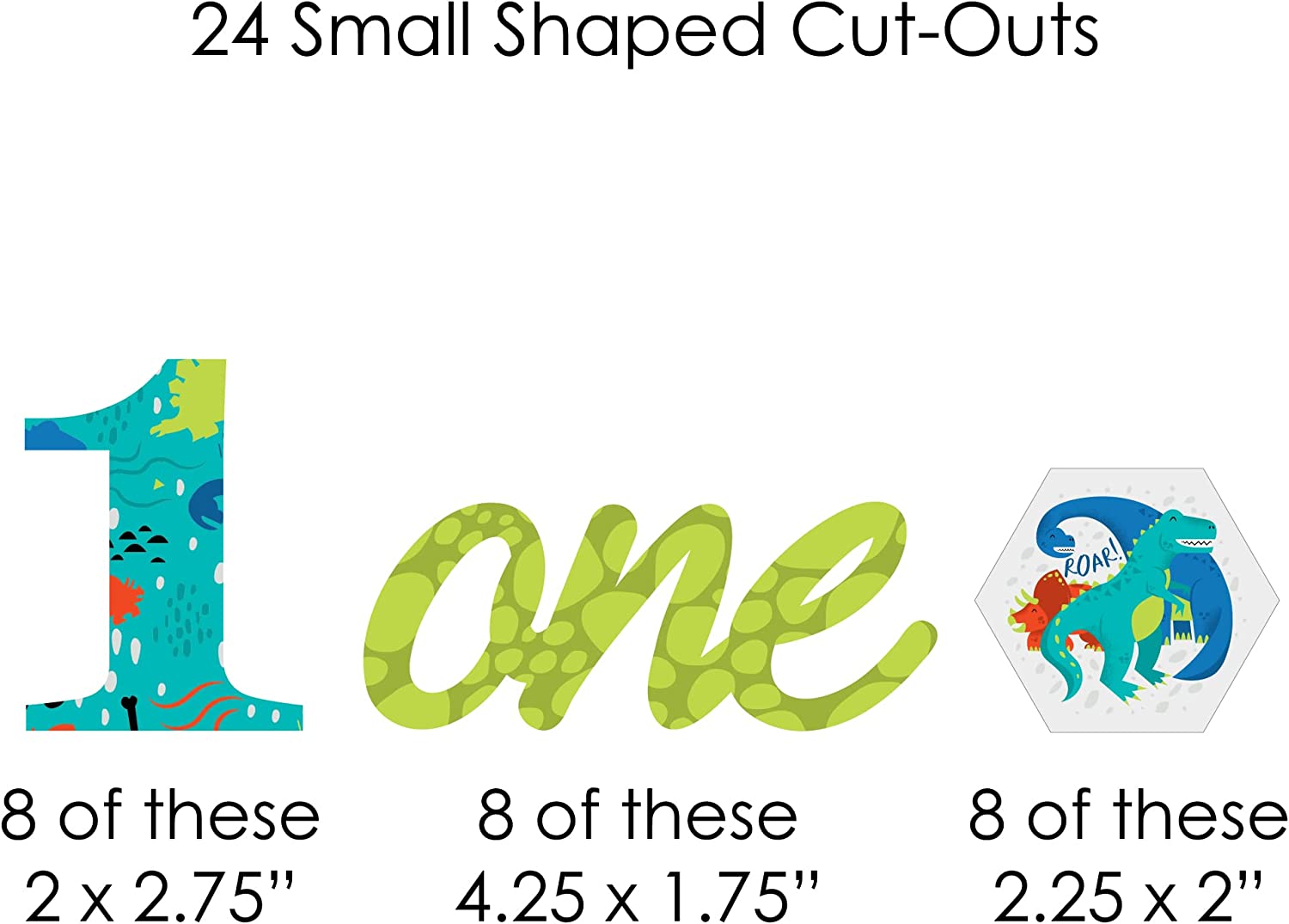 • DIY PARTY SUPPLIES: 1st Birthday Roar Dinosaur small paper shaped cut-out SIZE 8 #One (2 inches x 2.75 inches), 8 One (words) (4.25 inches x 1.75 inches), 8 Hexagon (2.25 inches x 2 inches). 1st Birthday Roar Dinosaur large paper shaped cut-outs SIZE 20 number one (5 inches x 7 inches).