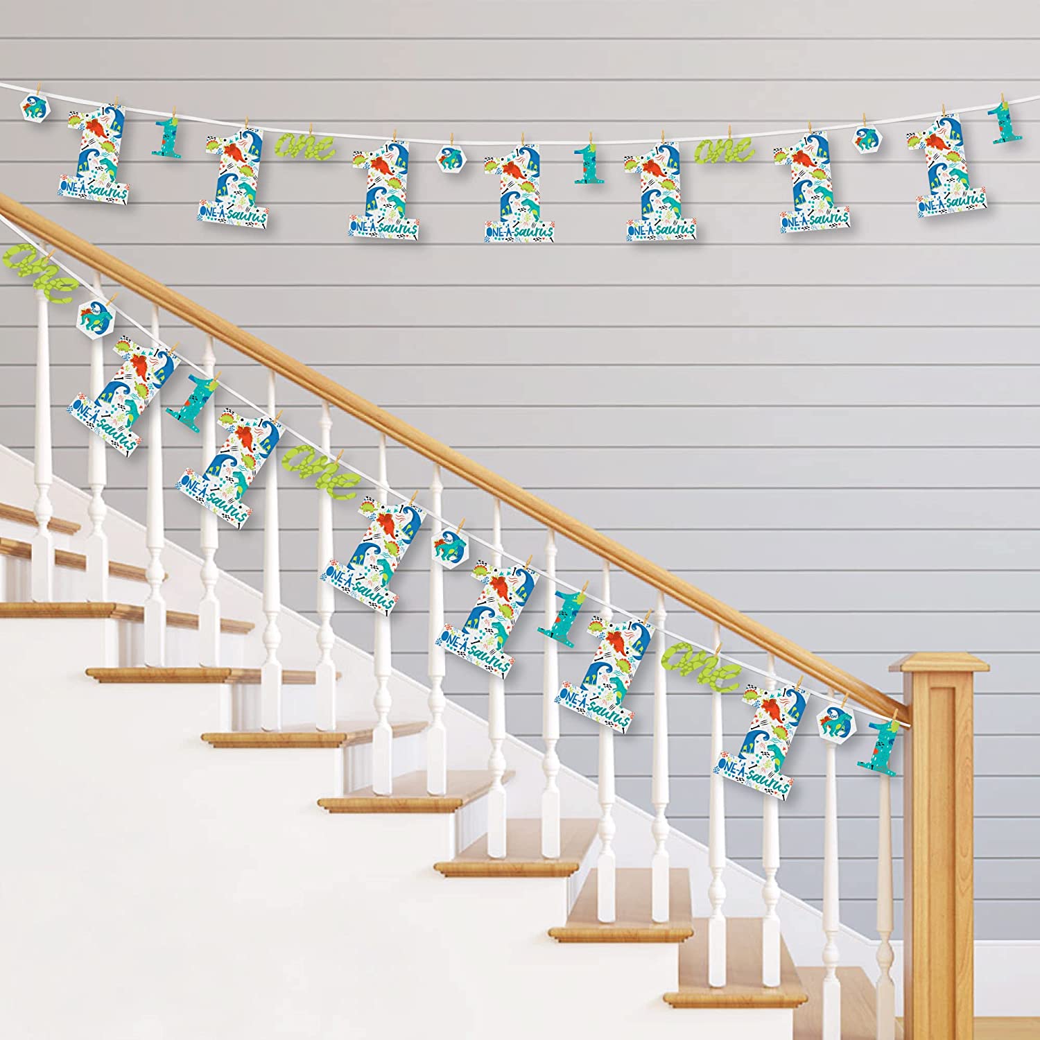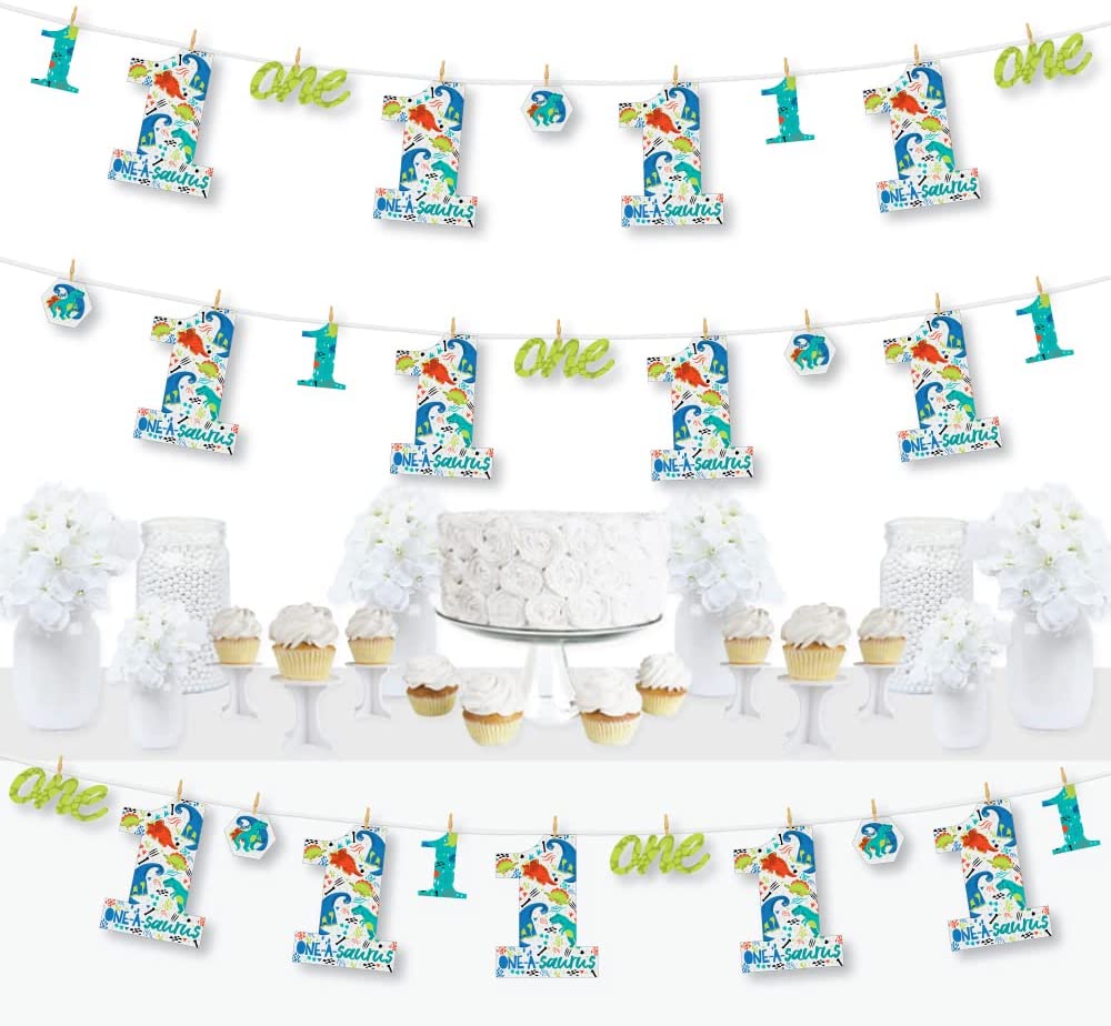 • PREMIUM PARTY DECORATION: 1st Birthday Roar Dinosaur large cut-outs are professionally printed double-sided. Small cut-outs are professionally printed with coordinating pattern on back, and all on sturdy cardstock paper with a photo-like shine. They are then individually cut, inspected and carefully packaged. 1st Birthday Roar Dinosaur clothespin garland banner is a 44-piece DIY kit that can be used in many ways. Get inspired with this fun do-it-yourself first birthday party decor kit!