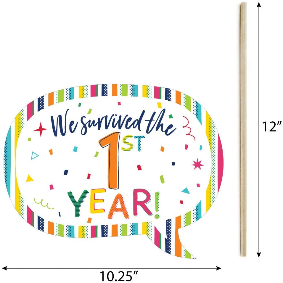 • 10-Piece Funny 1st Birthday - Cheerful Happy Birthday Photo Booth Props Kit INCLUDES 10 first rainbow arrow and speech bubble photo booth props, 10 wooden dowel sticks and stickers for assembly. EASY ASSEMBLY: Simply attach the printed DIY photo booth props to the wooden dowels with included reinforcing stickers.