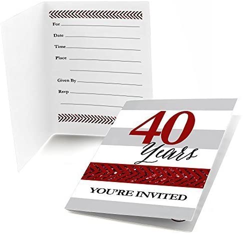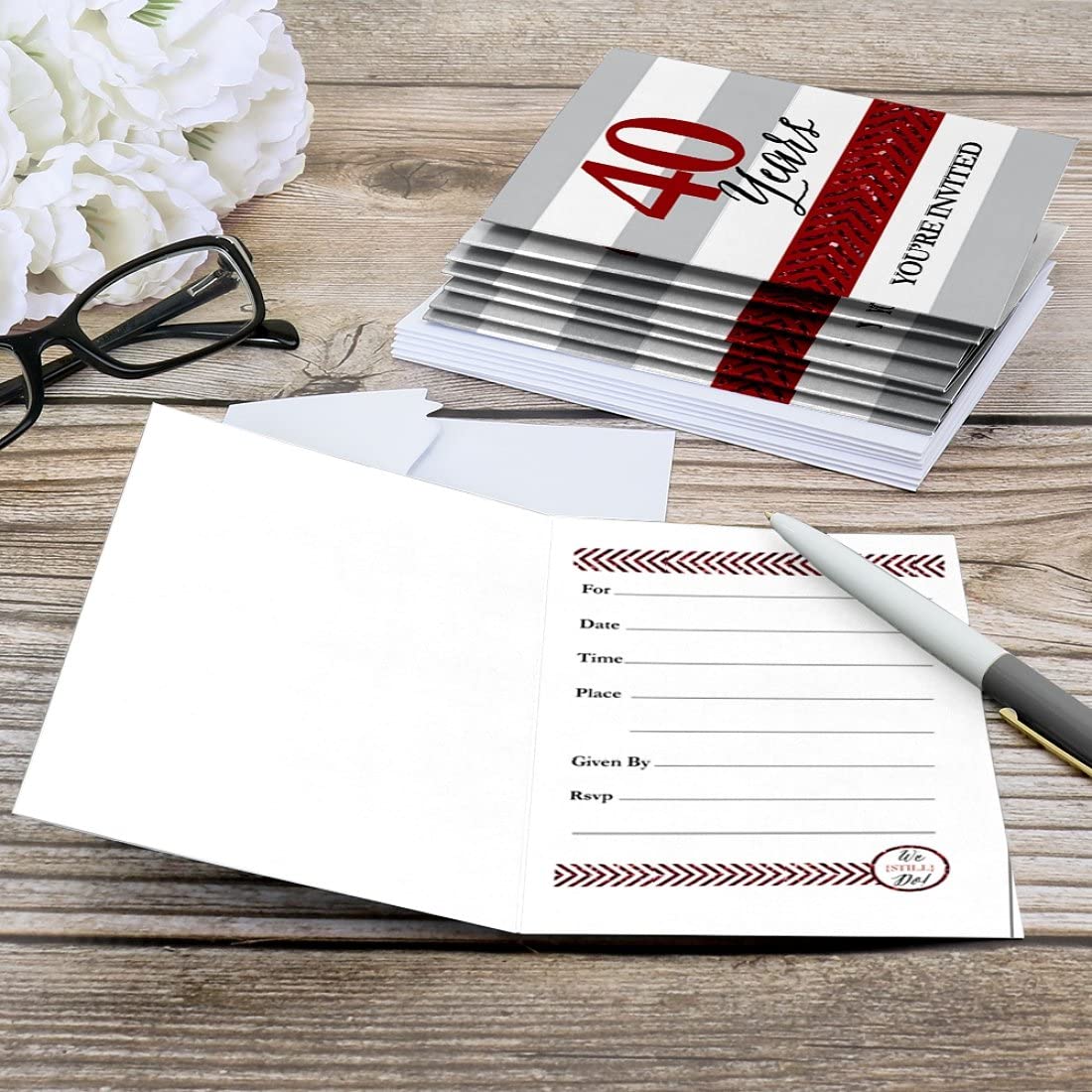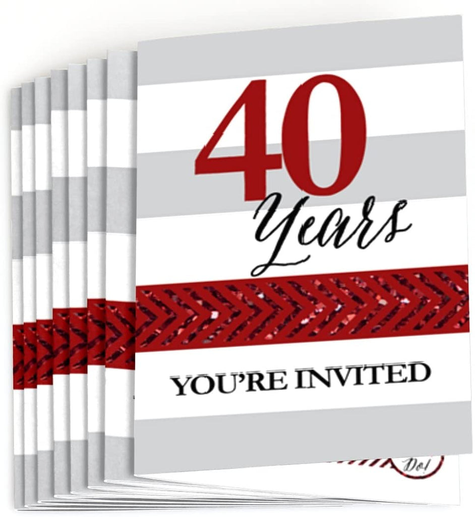 • PREMIUM PARTY INVITATIONS: We Still Do - 40th Wedding Anniversary party invitations are professionally printed on heavy-duty card stock paper with a photo-like shine. They are then hand-folded and individually inspected, then carefully packaged with our exclusive squiggle flap envelopes, making this ruby and white stationary set a must-have for a anniversary party.