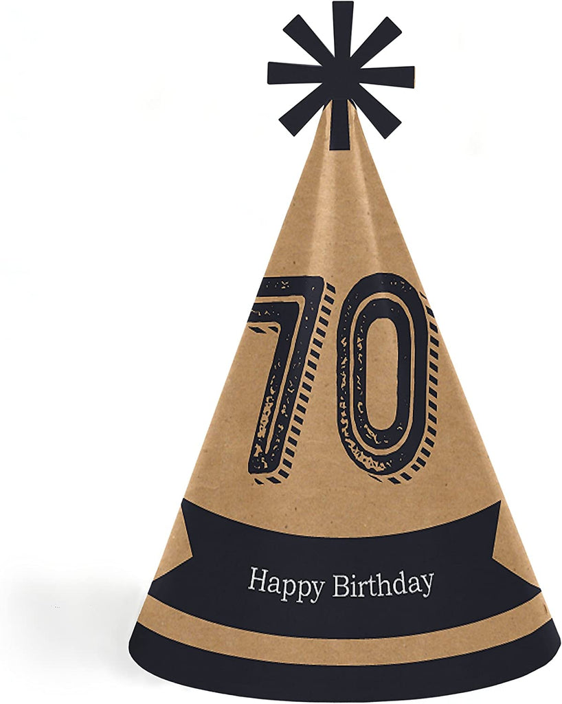 70th Milestone Birthday - Dashingly Aged to Perfection - Cone Happy Birthday Party Hats for Kids and Adults - Set of 8 (Standard Size)