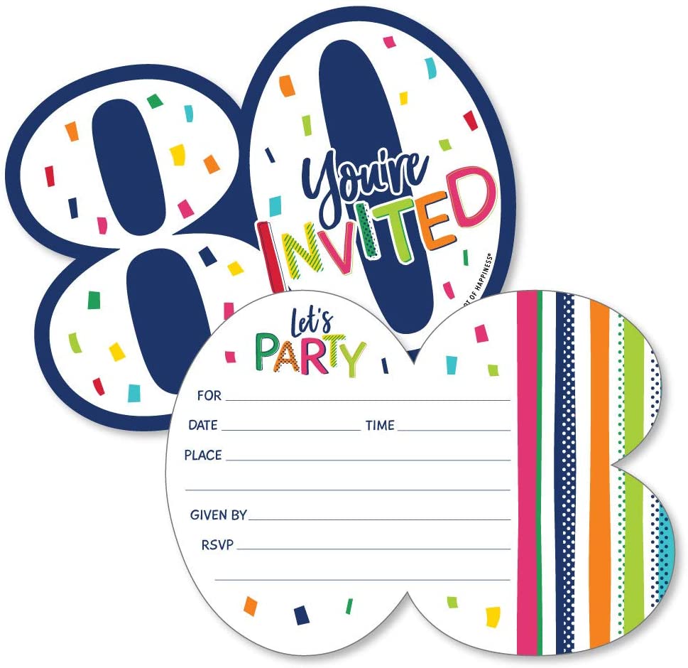 80th Birthday - Cheerful Happy Birthday - Shaped Fill-In Invitations - Colorful Eightieth Birthday Party Invitation Cards with Envelopes - Set of 12
