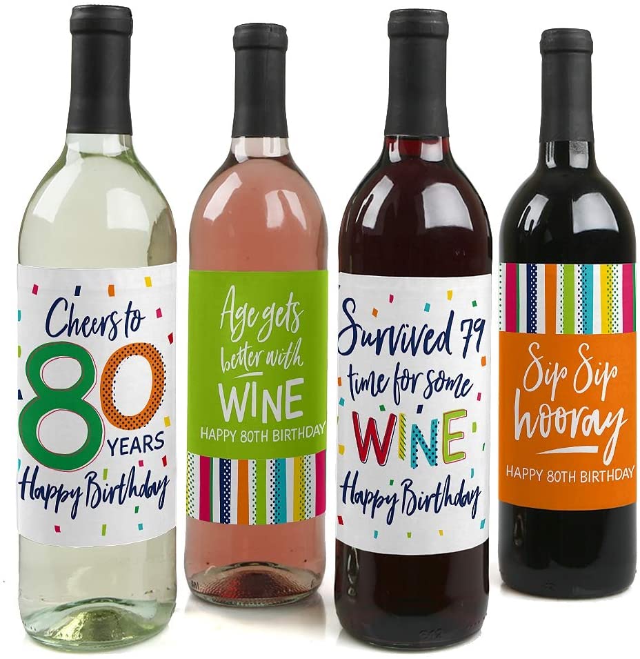 80th Birthday - Cheerful Happy Birthday - Colorful Eightieth Birthday Party Decorations for Women and Men - Wine Bottle Label Stickers - Set of 4