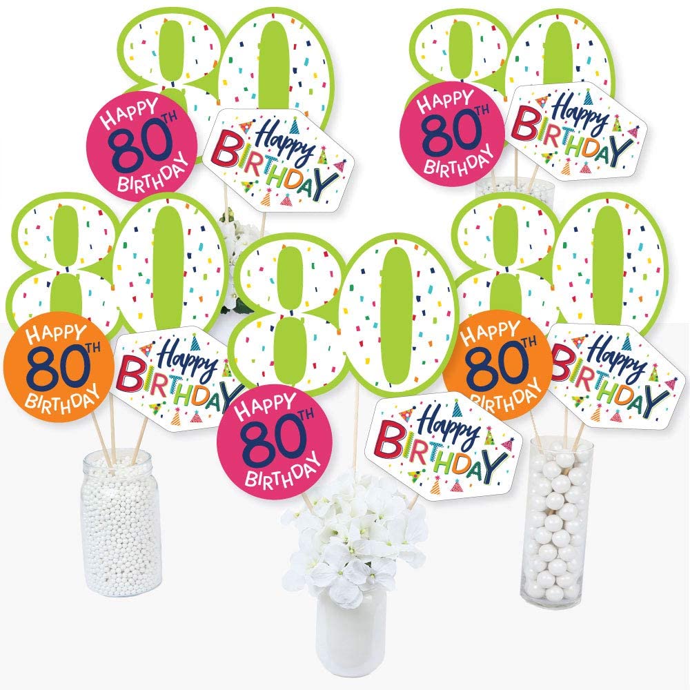 80th Birthday - Cheerful Happy Birthday - Colorful Eightieth Birthday Party Centerpiece Sticks - Table Toppers - Set of 15