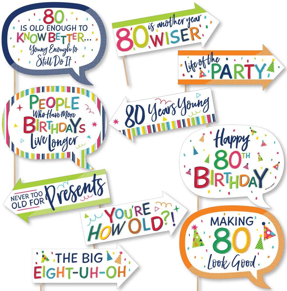 Funny 80th Birthday - Cheerful Happy Birthday - Colorful Eightieth Birthday Party Photo Booth Props Kit - 10 Piece