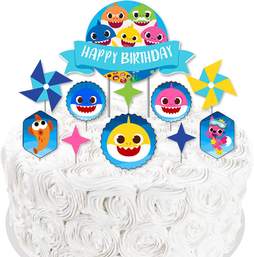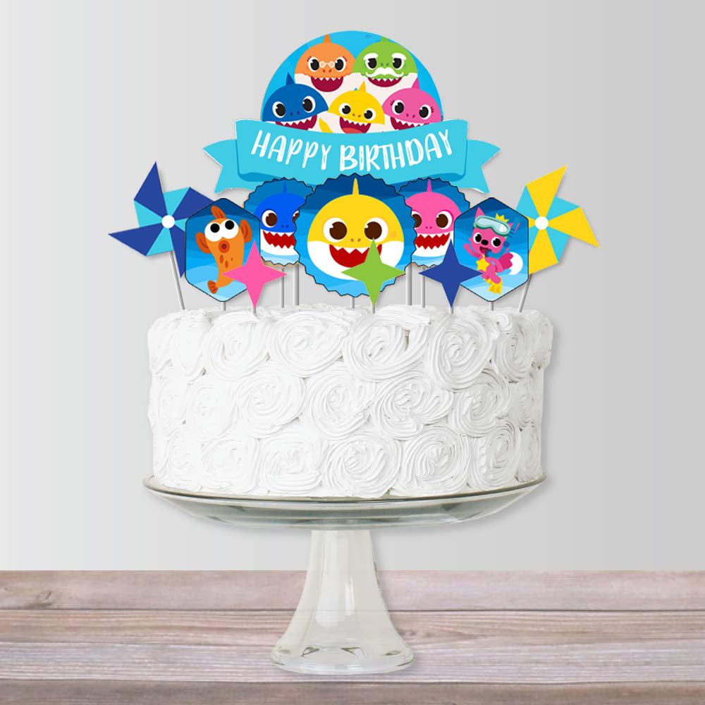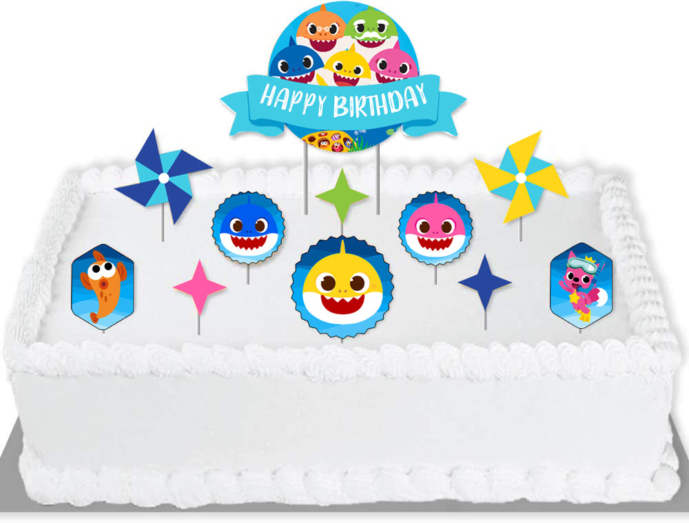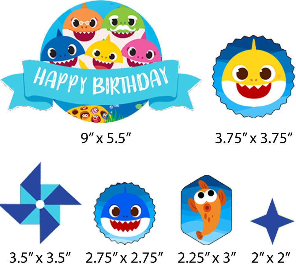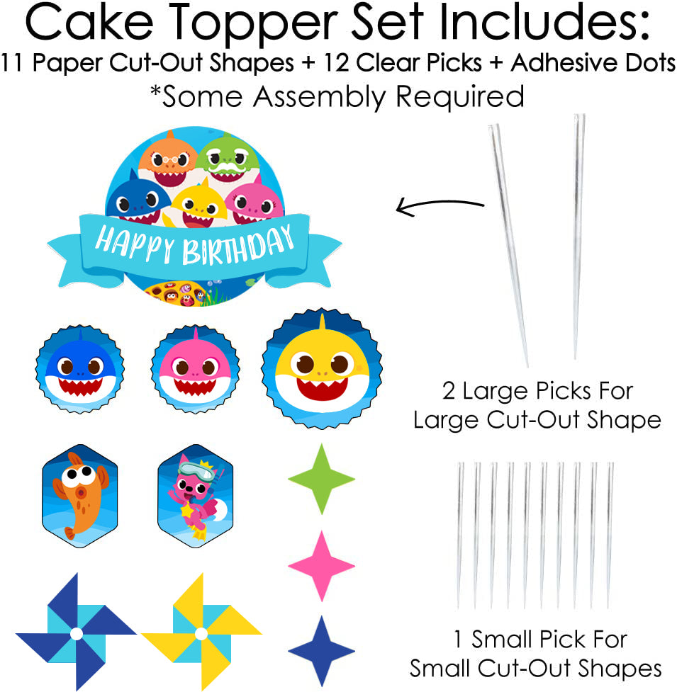 • Baby Shark - Cake Topper Set INCLUDES: 11 sturdy cardstock paper cut-out pieces, 12 clear picks, and sheet of adhesive dots for quick assembly. Some assembly required.