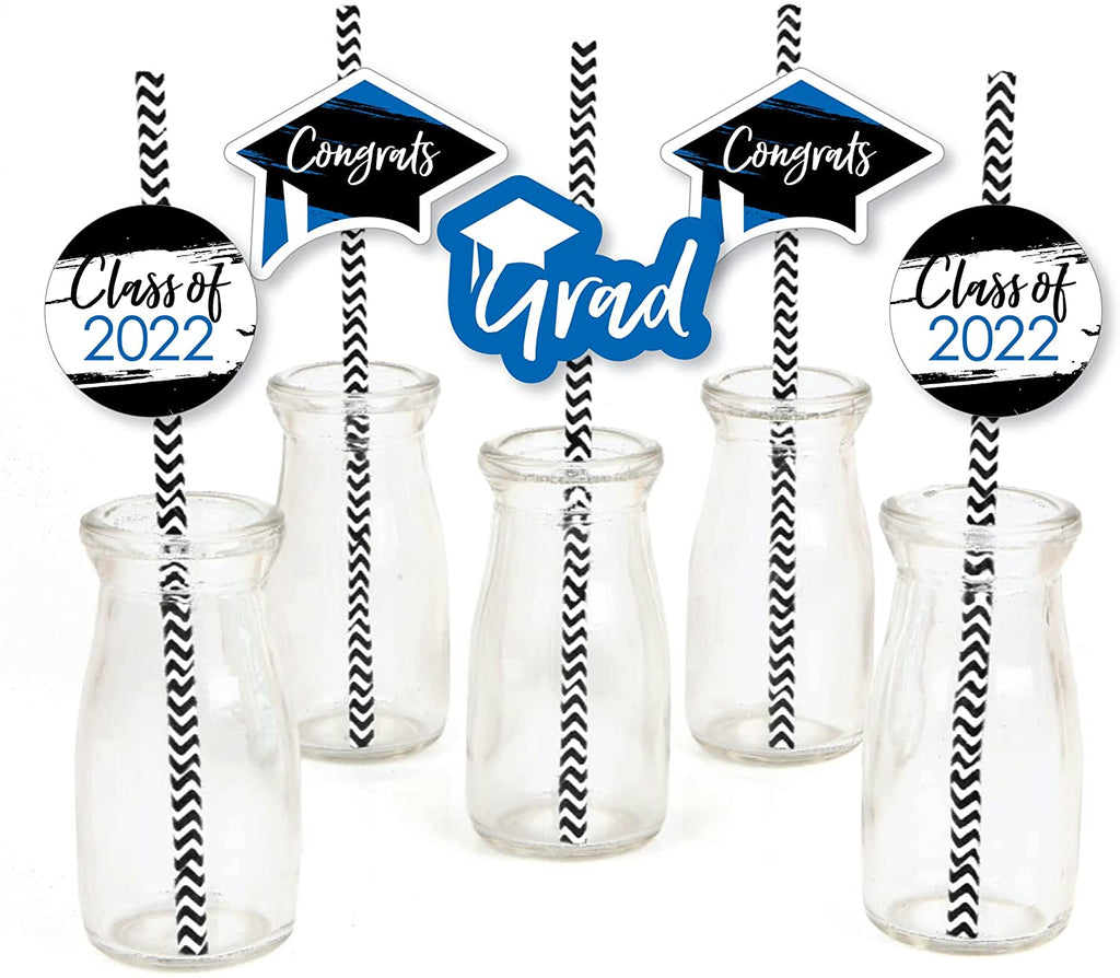 Blue Grad - Best is Yet to Come - Paper Straw Decor - Royal Blue 2022 Graduation Party Striped Decorative Straws - Set of 24
