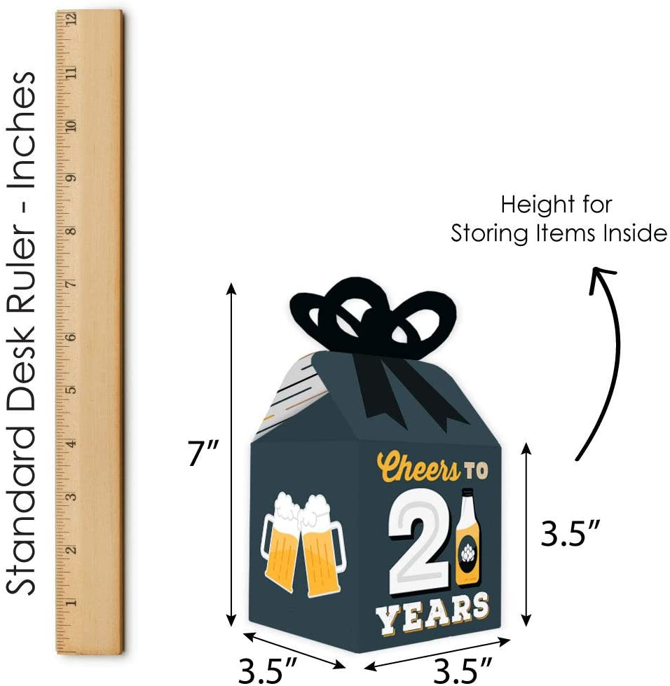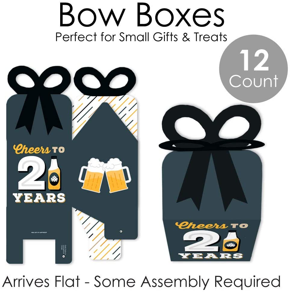 • Bow Boxes INCLUDE: 12 Cheers and Beers to 21 Years-themed square favor gift boxes. Each box SIZE measures 3.5 inches length x 3.5 inches width x 7 inches height. Bow boxes are ideal for small gifts and treats that are under 3.5 inches tall (height for storing items in closed box). When assembled and closed, each box creates a 3D paper bow-shaped top with a square bottom.
