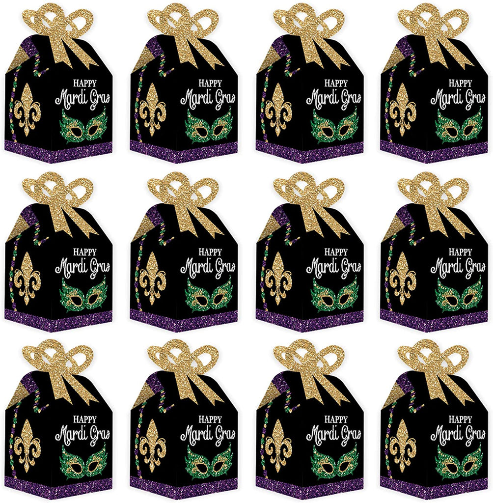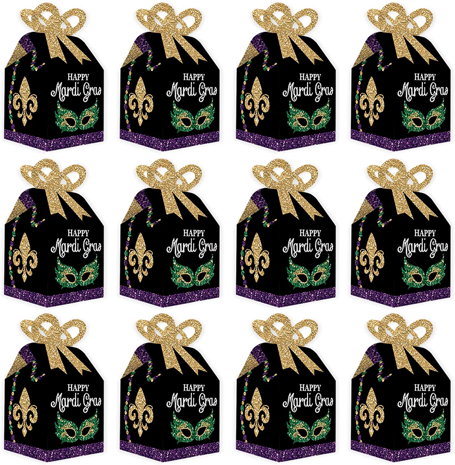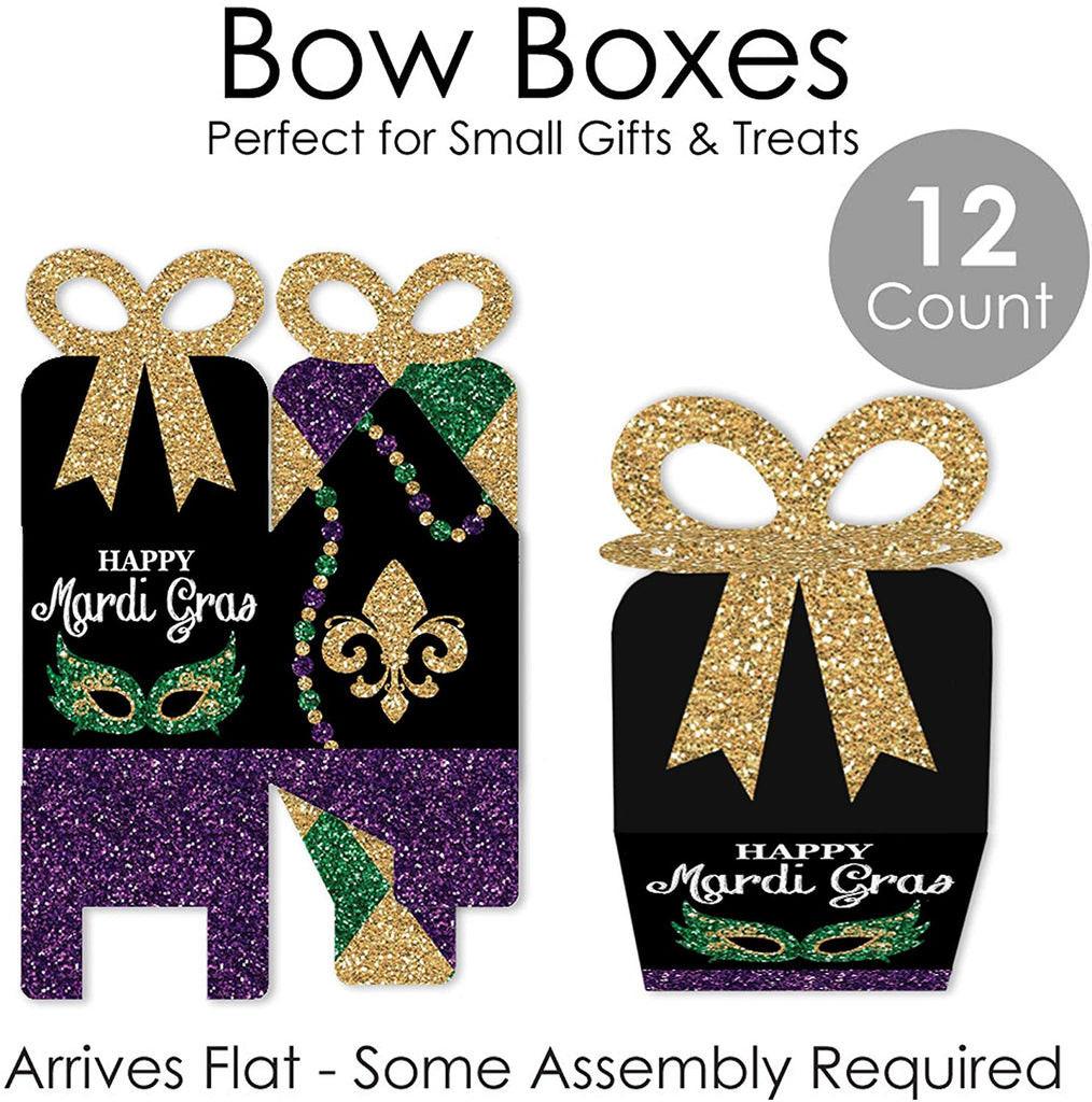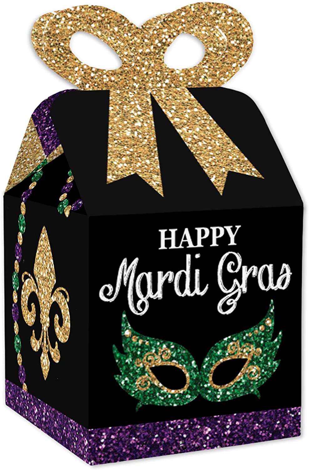 Mardi Gras - Square Favor Gift Boxes - Masquerade Party Bow Boxes - Set of 12 is backordered and will ship as soon as it is back in stock.