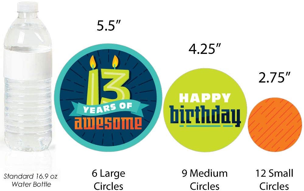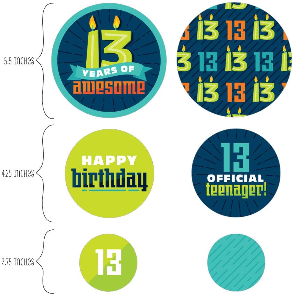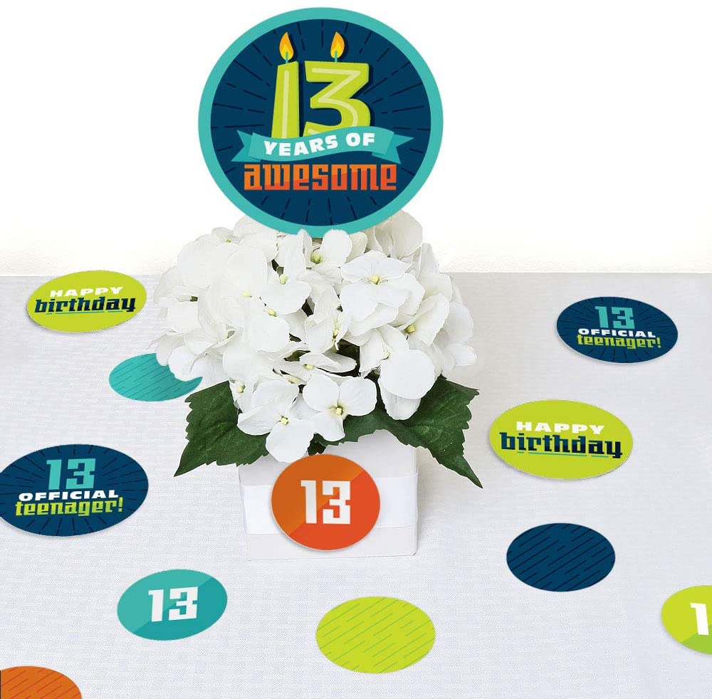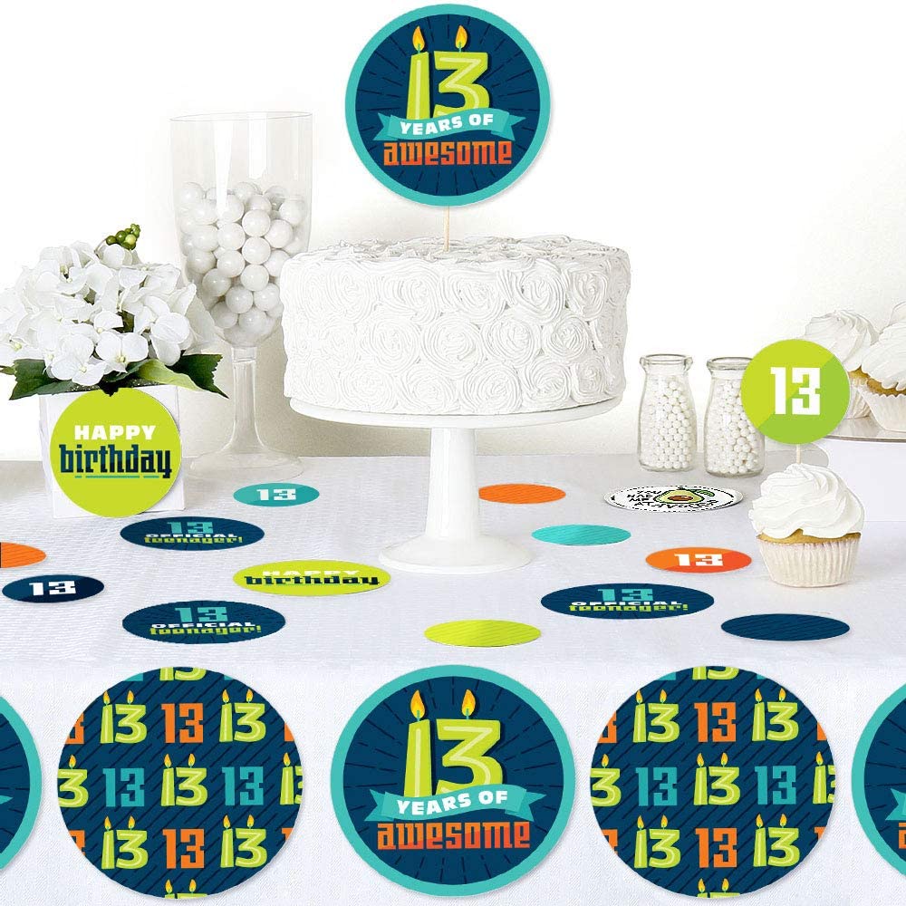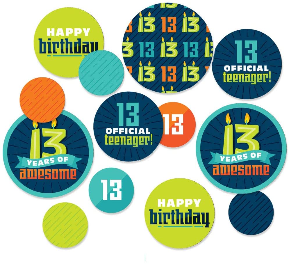 • Boy 13th Birthday Giant Circle Confetti INCLUDES 27 large official teenager birthday party confetti. Boy 13th Birthday decorations are perfect for a thirteenth birthday party.