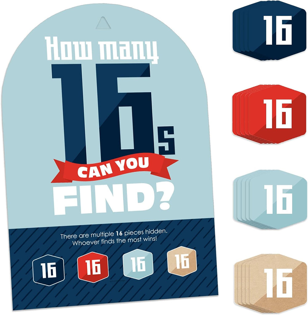 Boy 16th Birthday - Sweet Sixteen Birthday Party Scavenger Hunt - 1 Stand and 48 Game Pieces - Hide and Find Game