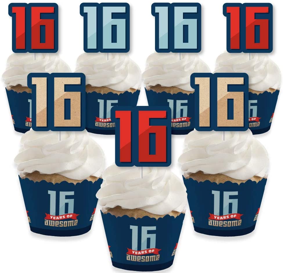Boy 16th Birthday - Cupcake Decoration - Sweet Sixteen Birthday Party Cupcake Wrappers and Treat Picks Kit - Set of 24