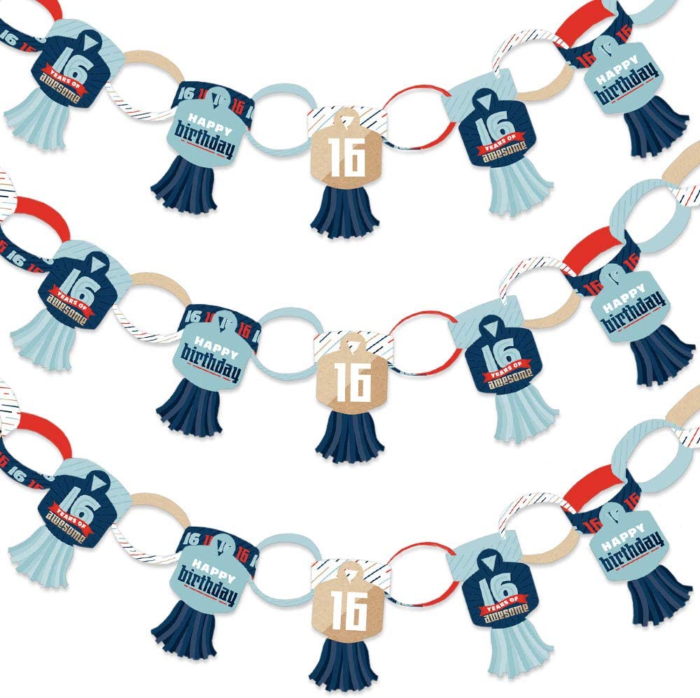 Boy 16th Birthday - 90 Chain Links and 30 Paper Tassels Decoration Kit - Sweet Sixteen Birthday Party Paper Chains Garland - 21 feet