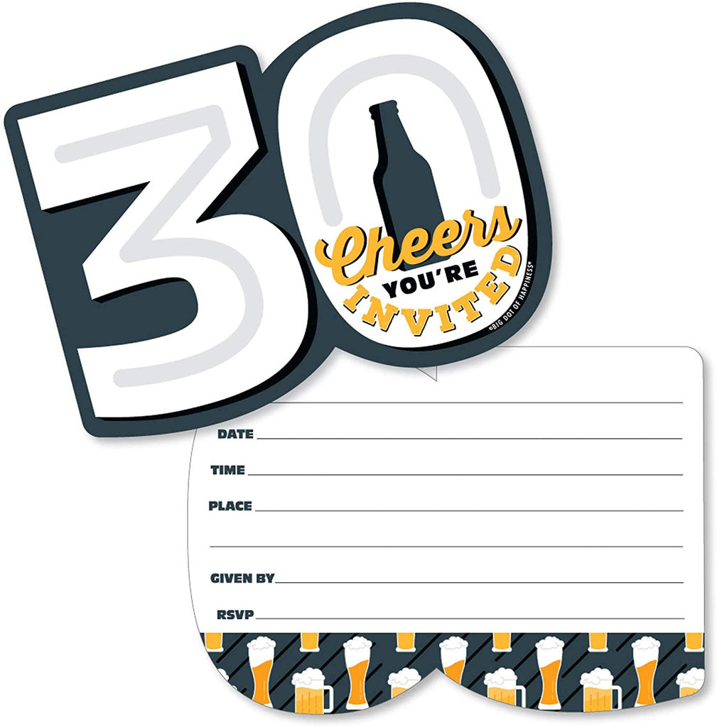 Cheers and Beers to 30 Years - Shaped Fill-In Invitations - 30th Birthday Party Invitation Cards with Envelopes - Set of 12