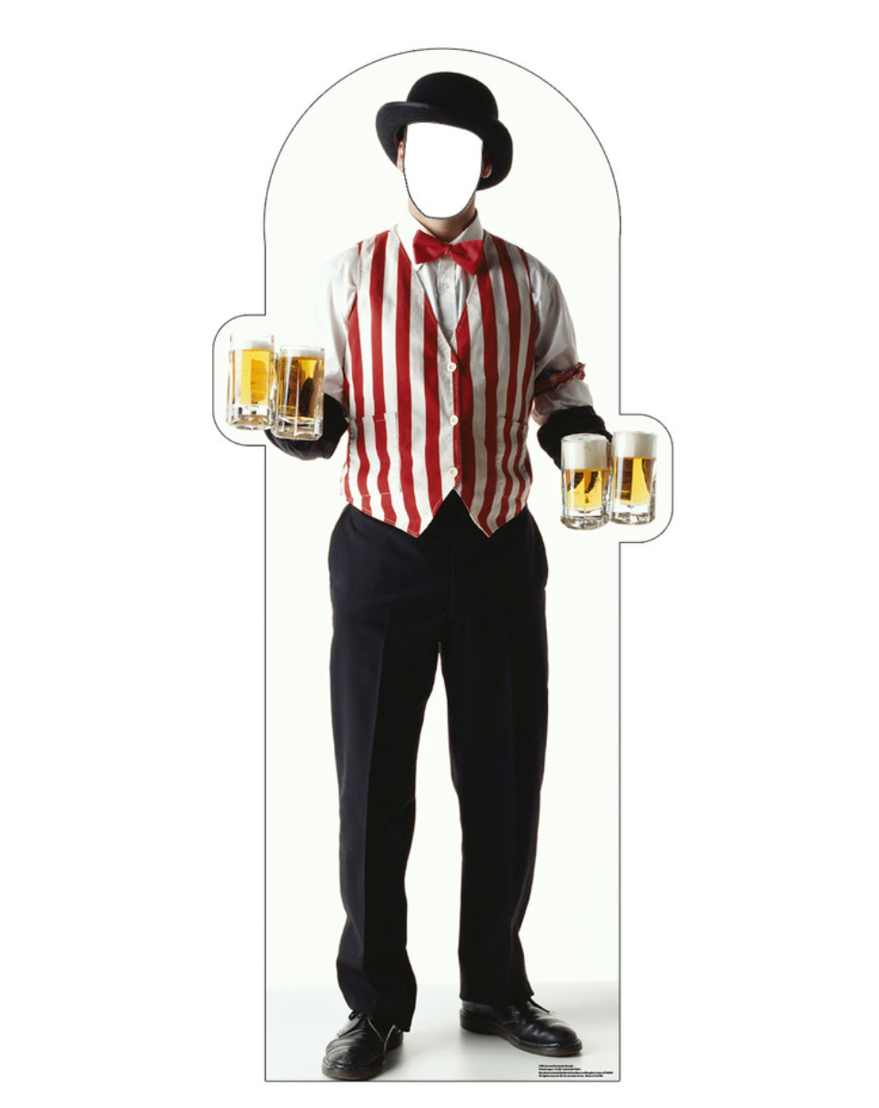 Carnival Bartender Standin 72 x 32 (height x width) inches is backordered and will ship as soon as it is back in stock.