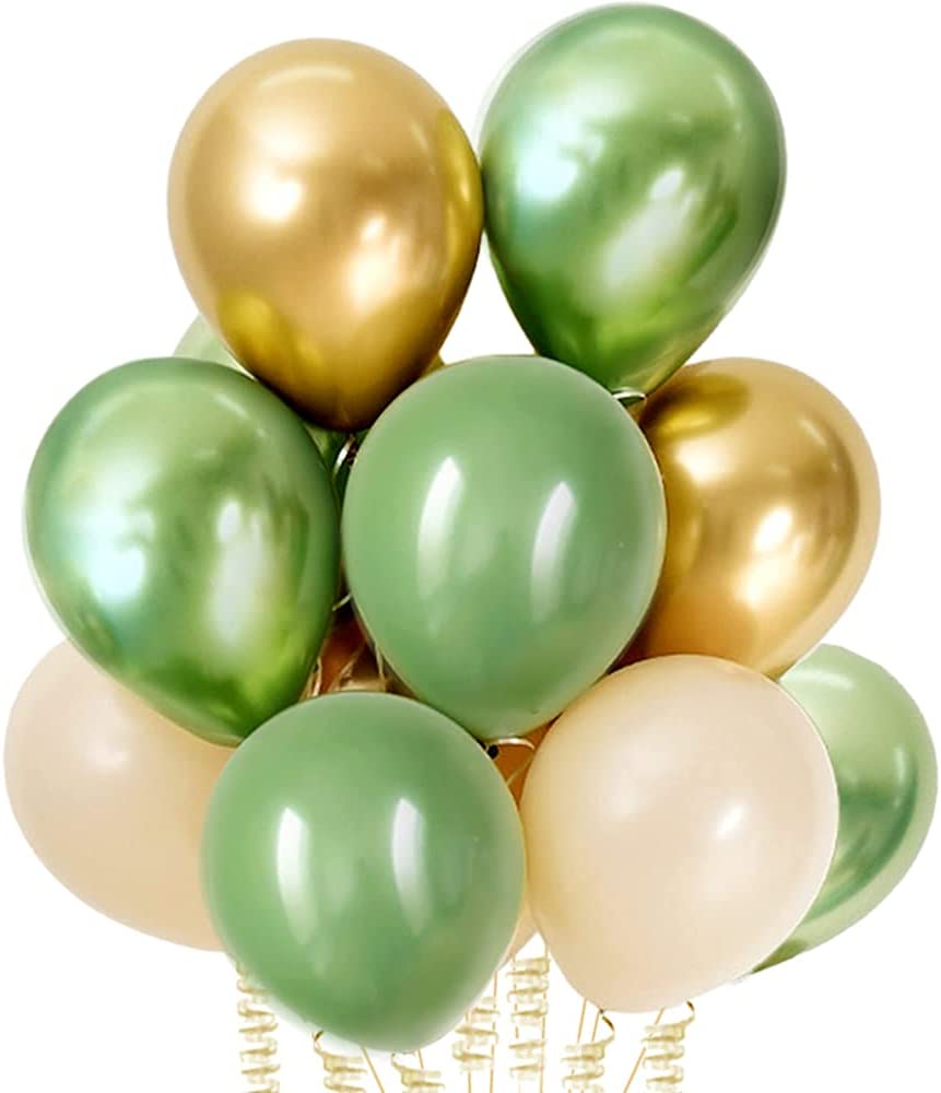 Items includes:- 20 Balloons:- 5 Vintage Green Latex Balloons- 5 Green Chrome Latex Balloons- 5 Cream Pearl Latex Balloons- 5 Gold Chrome Balloons- Curling Ribbon