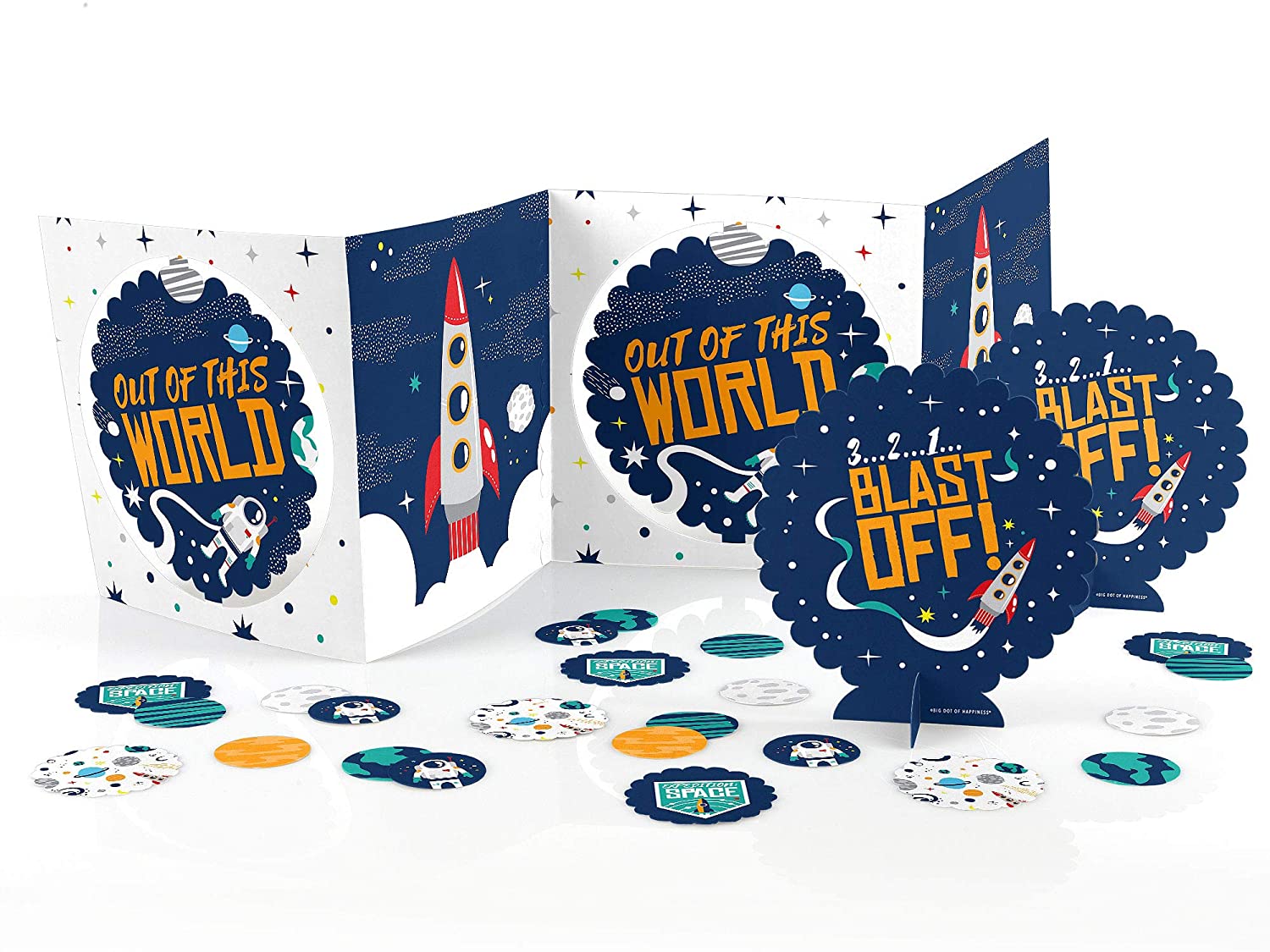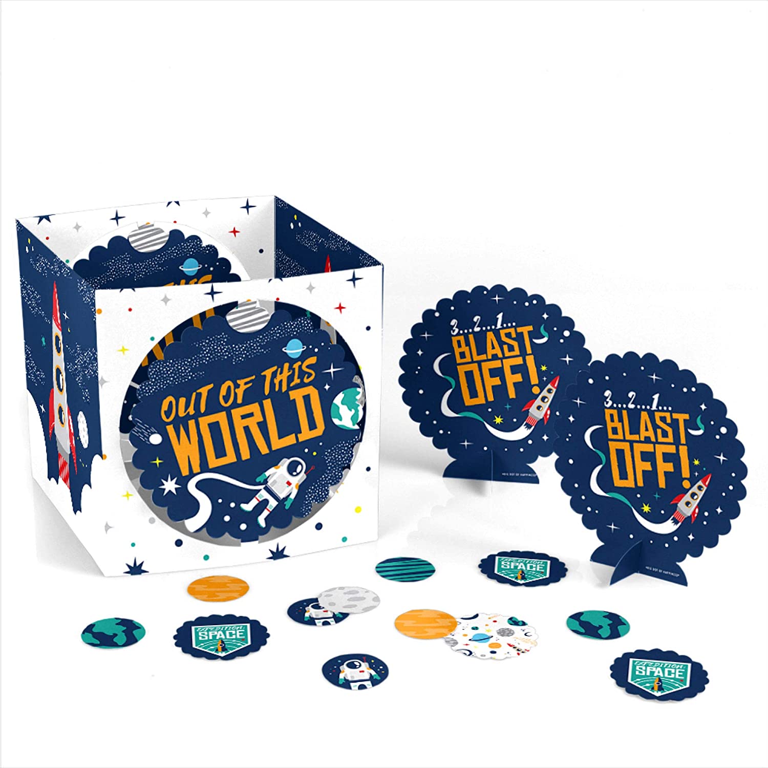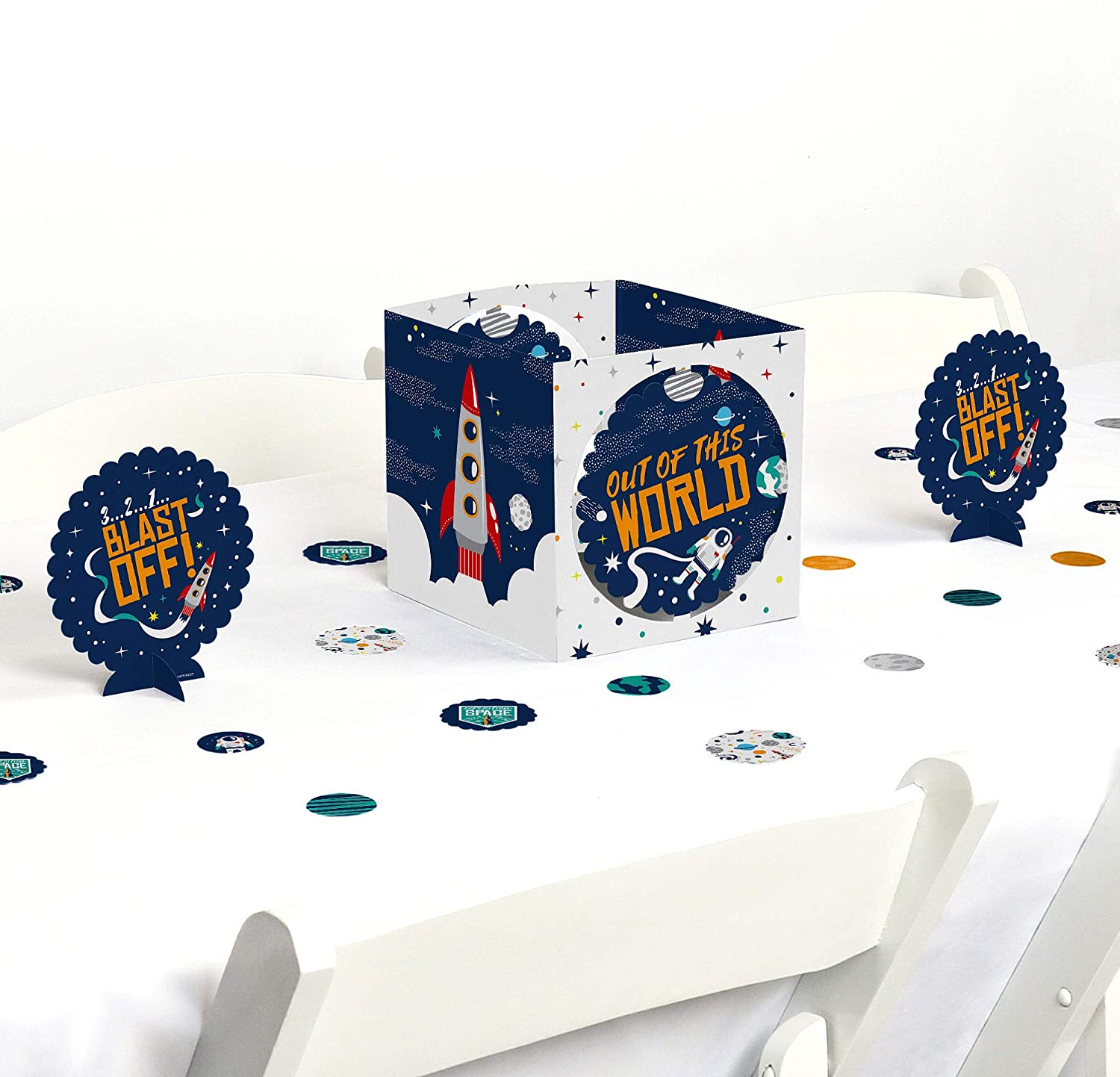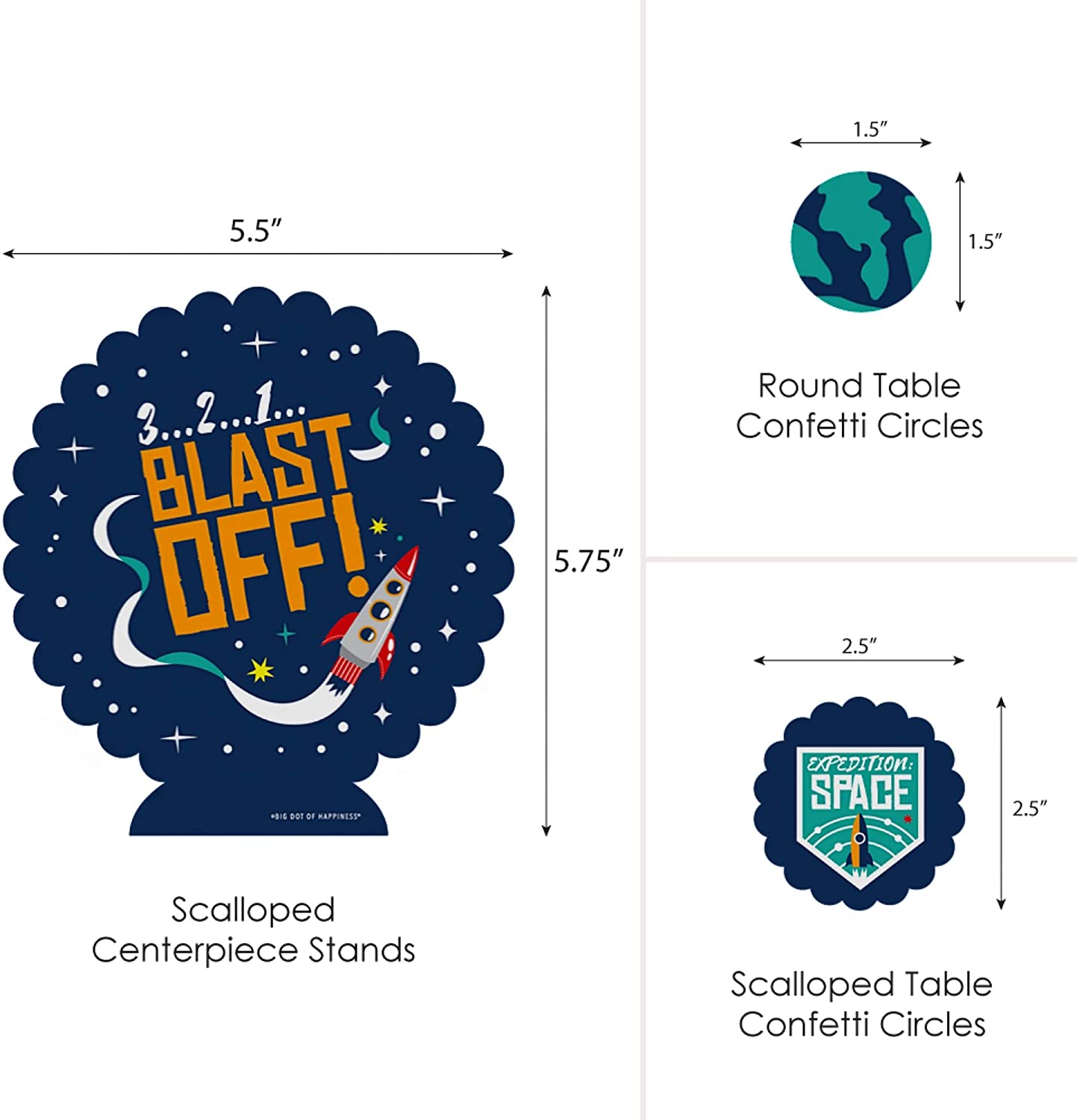 • Blast Off to Outer Space Table Decoration Kit INCLUDES 1 large rocket ship centerpiece, 2 scalloped centerpieces, 12 scalloped table confetti pieces and 24 round table confetti pieces. Blast Off to Outer Space party table decorations are perfect for a baby shower or birthday party.