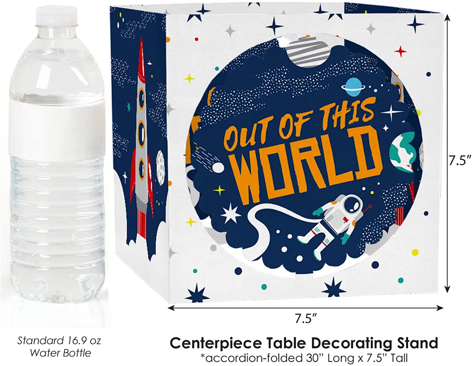 • Blast Off to Outer Space party decoration kit SIZE 1 Accordion-Folded Centerpiece (may also be formed into a cube using the included stickers), 30" long x 7.5" tall; 2 Scalloped Centerpiece Stands, 5.5" wide x 5.75" tall; 12 Scalloped Table Confetti Circles, 2.5" diameter; and 24 Round Table Confetti Circles, 1.5" diameter. The unique design and variety of pieces makes this astronaut party decoration kit an impressive addition to any baby shower or birthday party.
