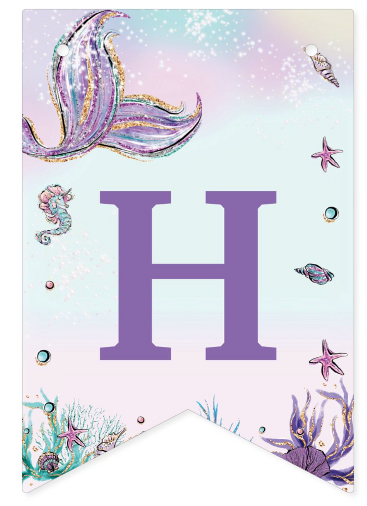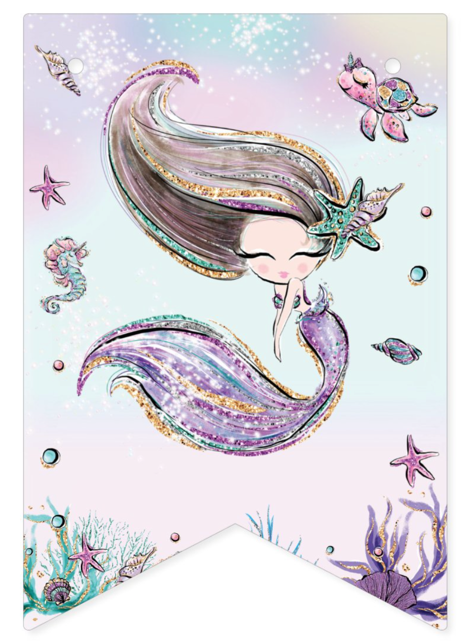 Complete your party with this whimsical mermaid flag banner decoration. Featuring a pretty mermaid and cute ocean creatures. Personalize it easily with a name and occasion or with any special message! Great for baby shower, birthday party, Christening / Baptism, New Baby and more!