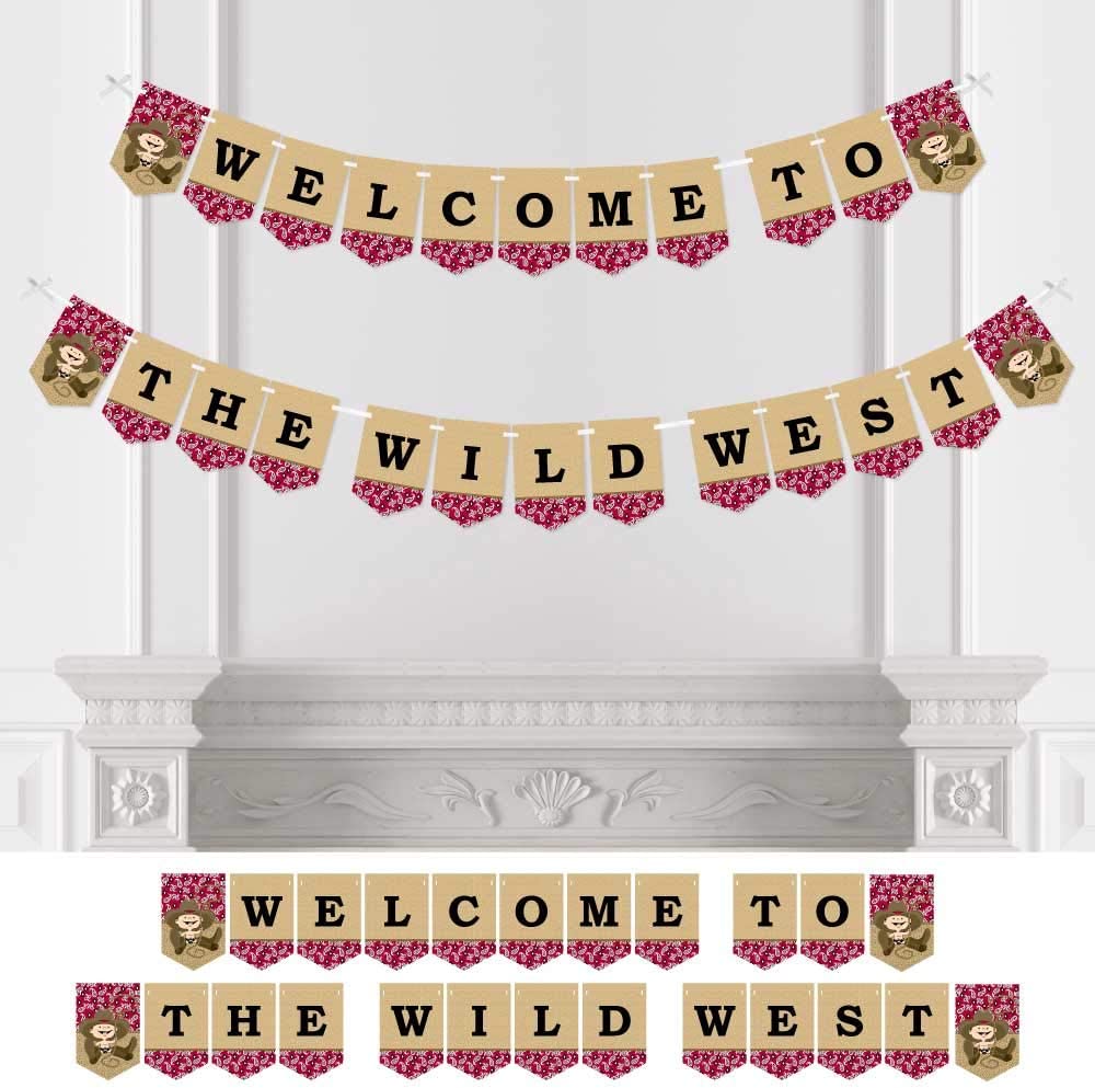 • Little Cowboy Bunting Banner is an impressive baby shower or birthday party decoration for your party. Little Cowboy Bunting Banner Decoration Kit INCLUDES Welcome to The Wild West letter pennant, western themed pennants, satin ribbon and non-marking wall mounts for hanging.