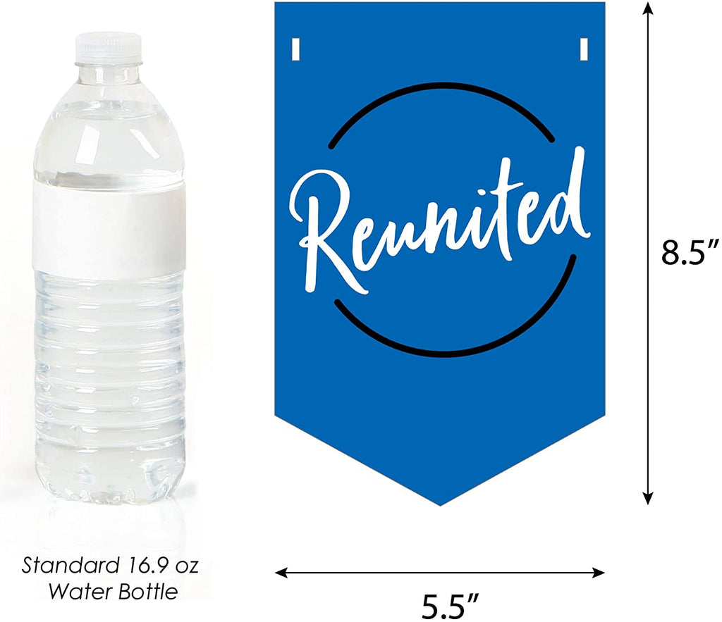• PREMIUM SCHOOL CLASS REUNION PARTY SUPPLIES: Reunited Blue Bunting Banner is professionally printed on sturdy cardstock paper. Each pennant is individually inspected then carefully packaged by hand. Reunited Blue bunting banners requires some easy assembly. Following the number sequence on the back of each pennant, simply string the included satin ribbon through the pennant slots. Create multiple rows by cutting the ribbon to your desired length or hang as one long banner.