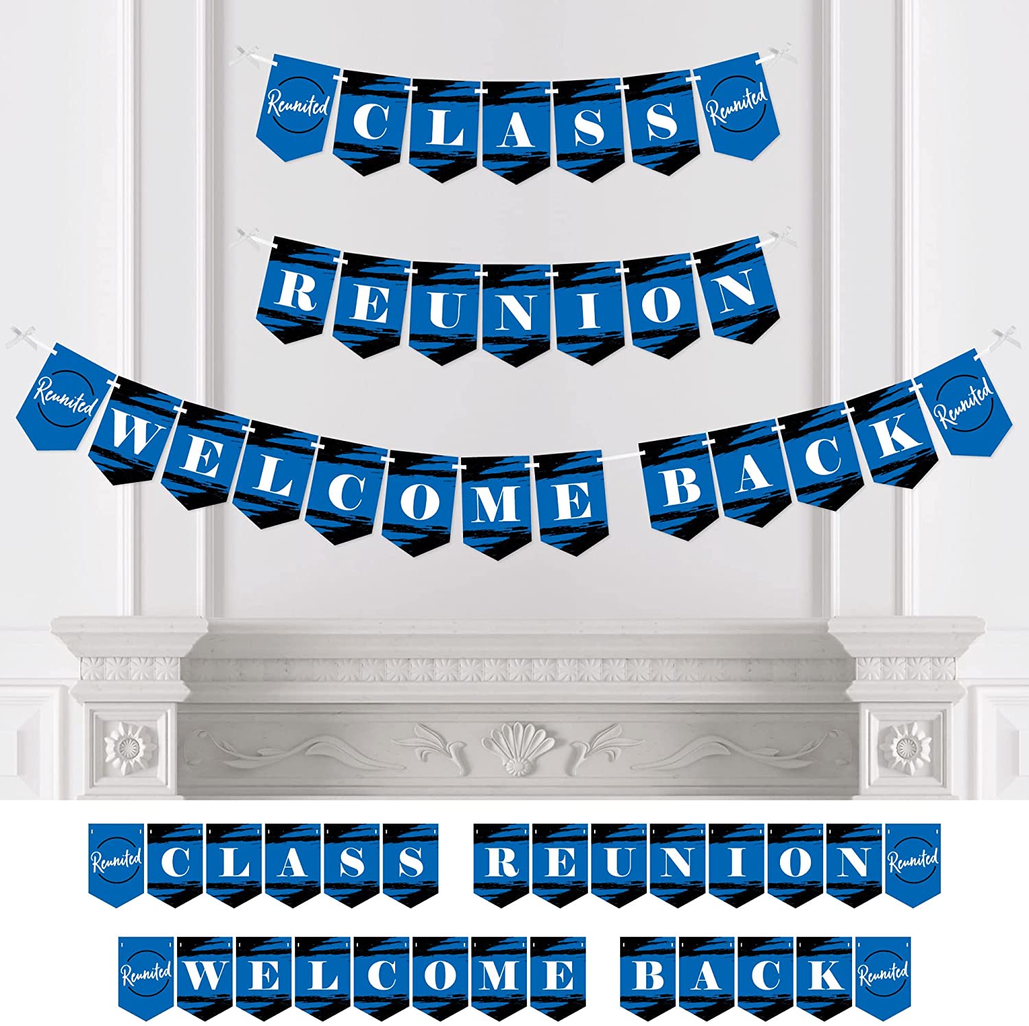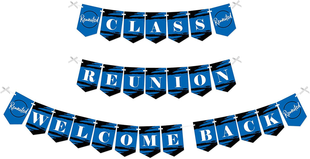 • Reunited Blue Bunting Banner is an impressive party decoration for your event. Reunited Blue Bunting Banner Decoration Kit INCLUDES “CLASS REUNION WELCOME BACK” letter pennant, blue and black themed pennants, satin ribbon and non-marking wall mounts for hanging.