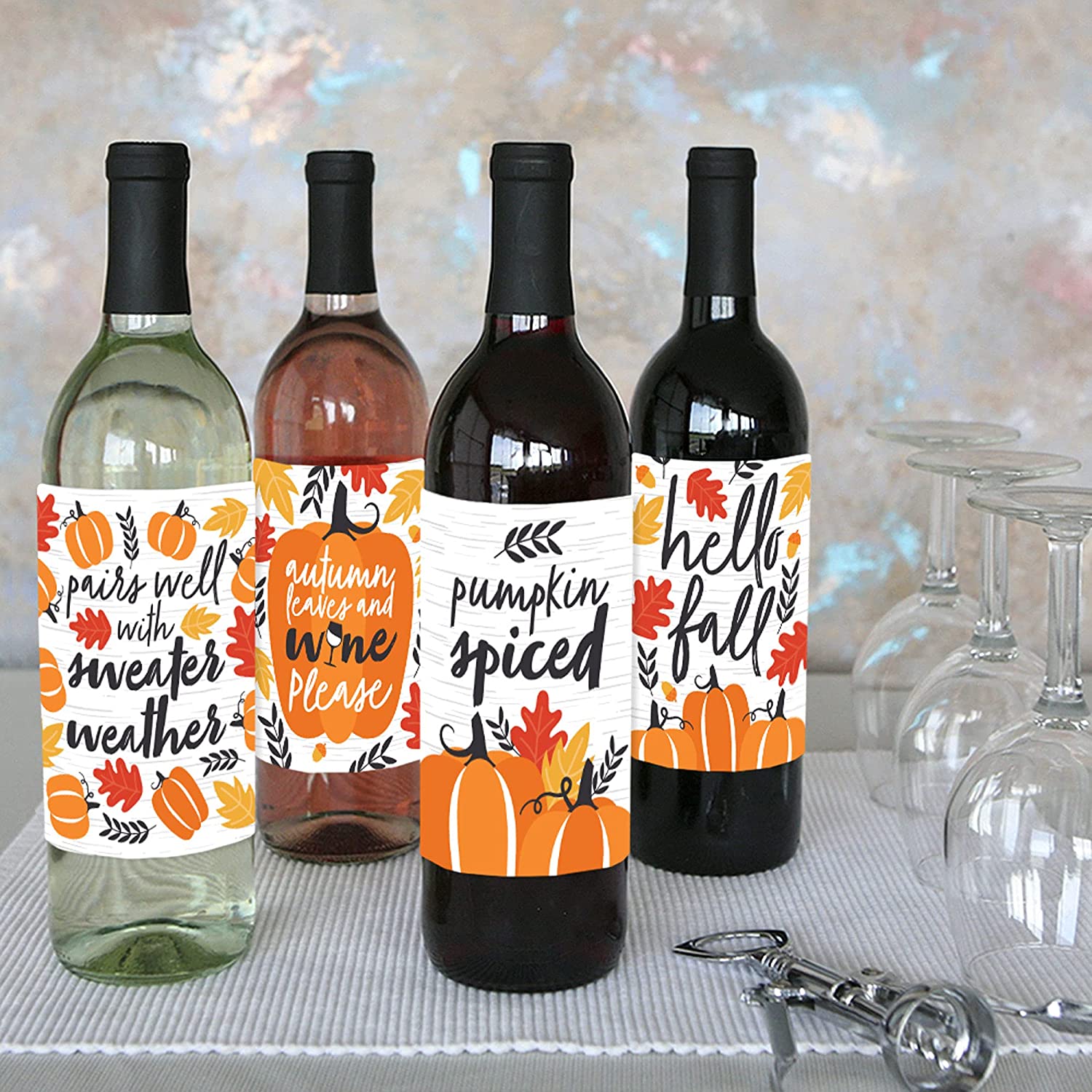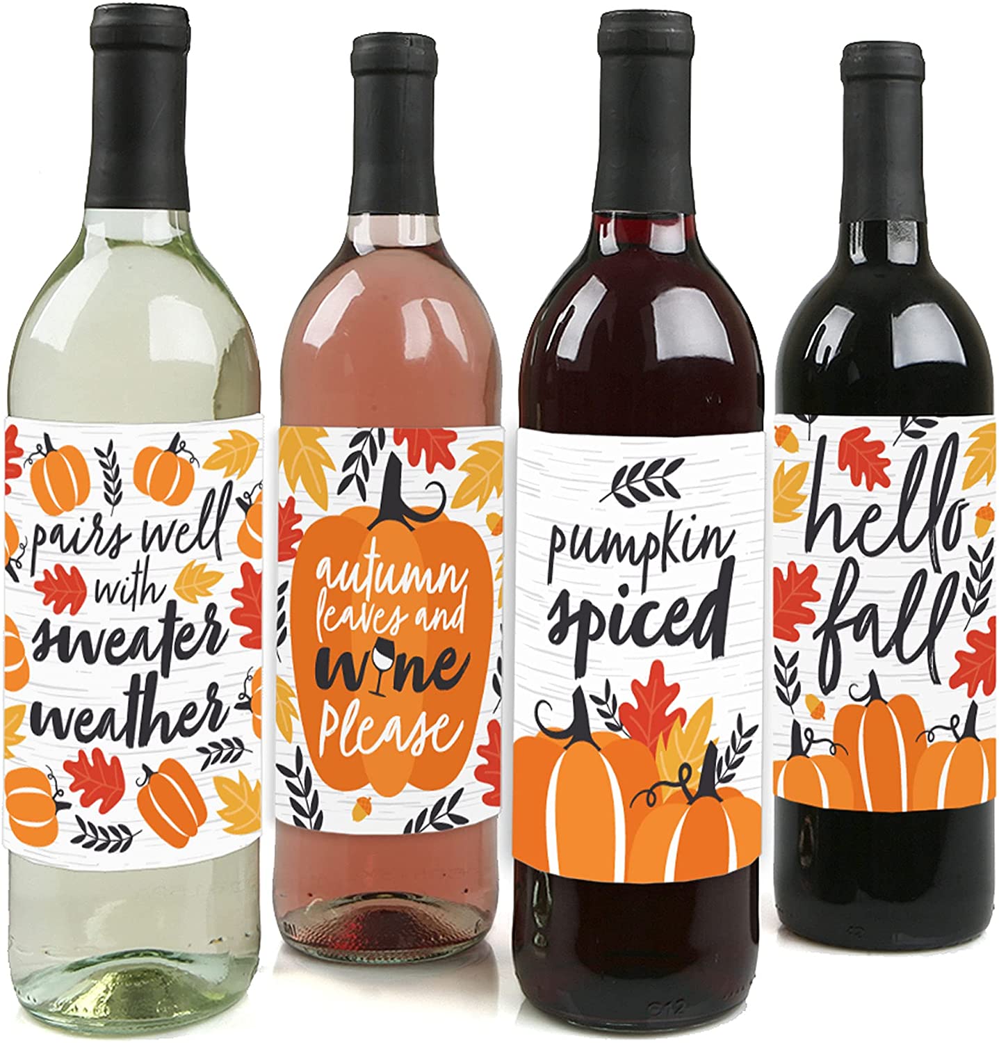 • UNIQUE GIFT IDEA: Hello Fall Wine Bottle Labels also make a great gift idea. Add Fall Pumpkin Wine Bottle labels to a favorite bottle of wine or spirits for a special gift. Use each wine label on a favorite beverage bottle and gift individually or create an impressive gift basket using all 4 labels on coordinating wine or liquor bottles. Wine bottle labels will easily give your gift a personal touch!