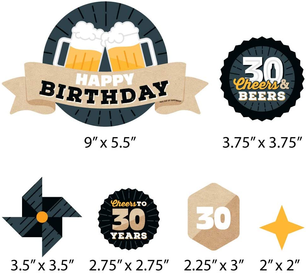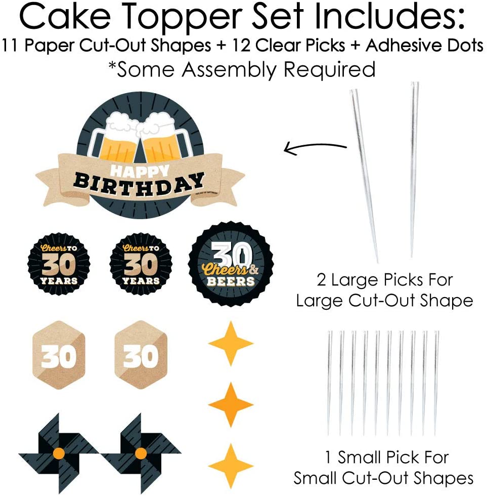 • Cheers and Beers to 30 Years Cake Topper Set INCLUDES: 11 sturdy cardstock paper cut-out pieces, 12 clear picks, and sheet of adhesive dots for quick assembly. Some assembly required.