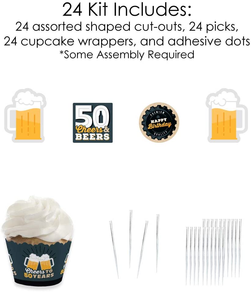 • Cheers and Beers to 50 Years Cupcake Wrappers and Treat Picks Kit INCLUDES 24 assorted shaped paper cut-outs, 24 clear treat picks, 24 cupcake wrappers, and adhesive dots for easy assembly. DIY Cheers and Beers to 50 Years cupcake decoration kit is perfect for any 50th birthday party.