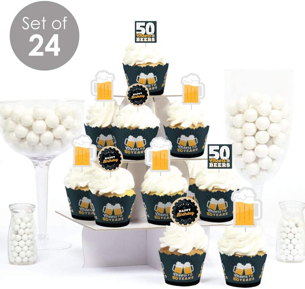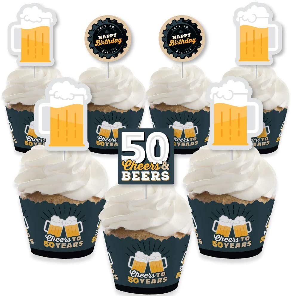 Cheers and Beers to 50 Years - Cupcake Decoration - 50th Birthday Party Cupcake Wrappers and Treat Picks Kit - Set of 24