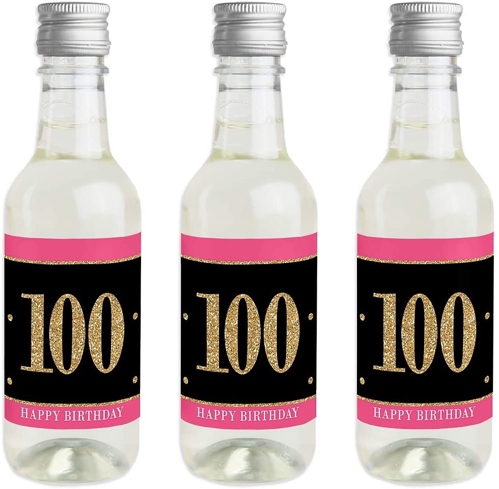 Chic 100th Birthday - Pink, Black and Gold - Mini Wine and Champagne Bottle Label Stickers - Birthday Party Favor Gift for Women and Men - Set of 16