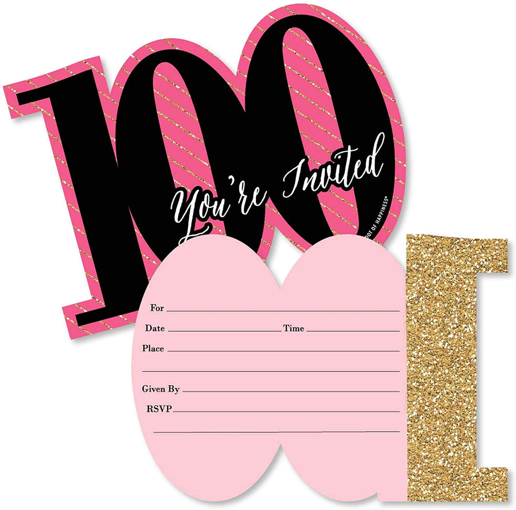 Chic 100th Birthday - Pink, Black and Gold - Shaped Fill-In Invitations - Birthday Party Invitation Cards with Envelopes - Set of 12