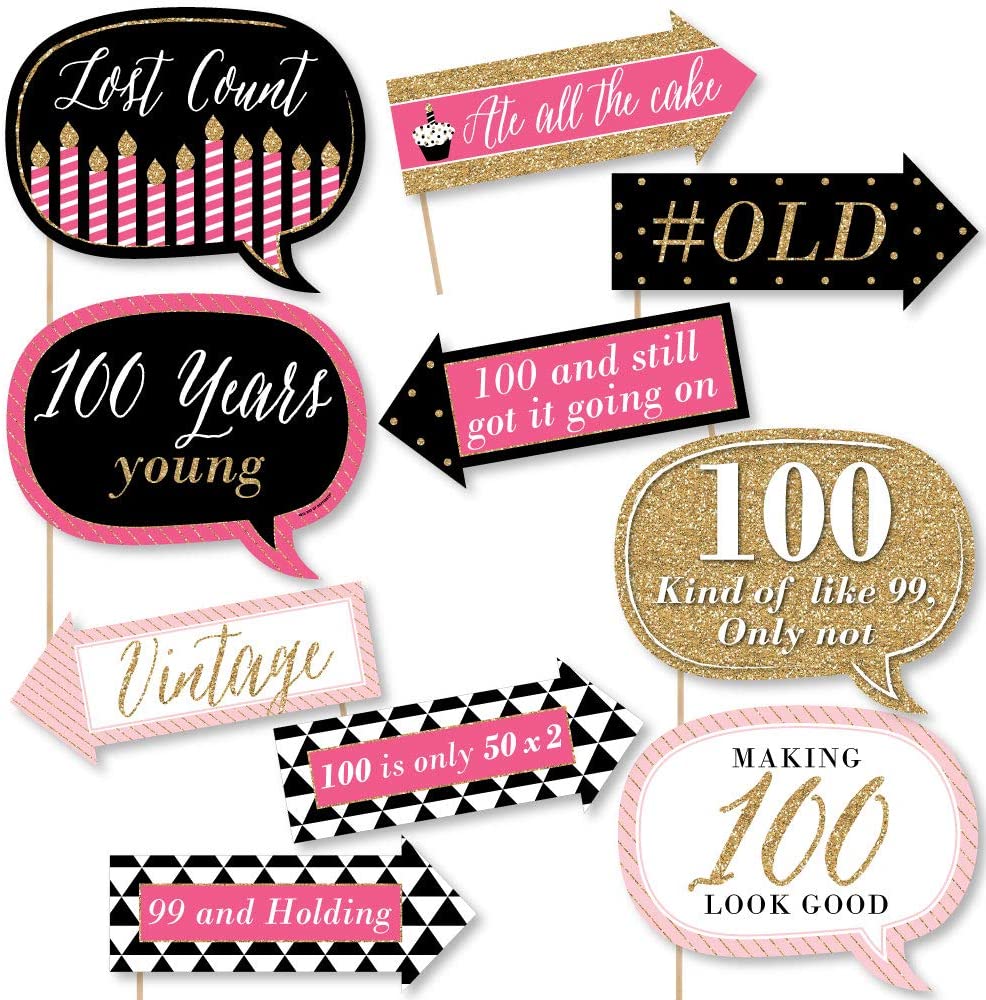 unny Chic 100th Birthday - Pink, Black and Gold - Birthday Party Photo Booth Props Kit - 10 Piece