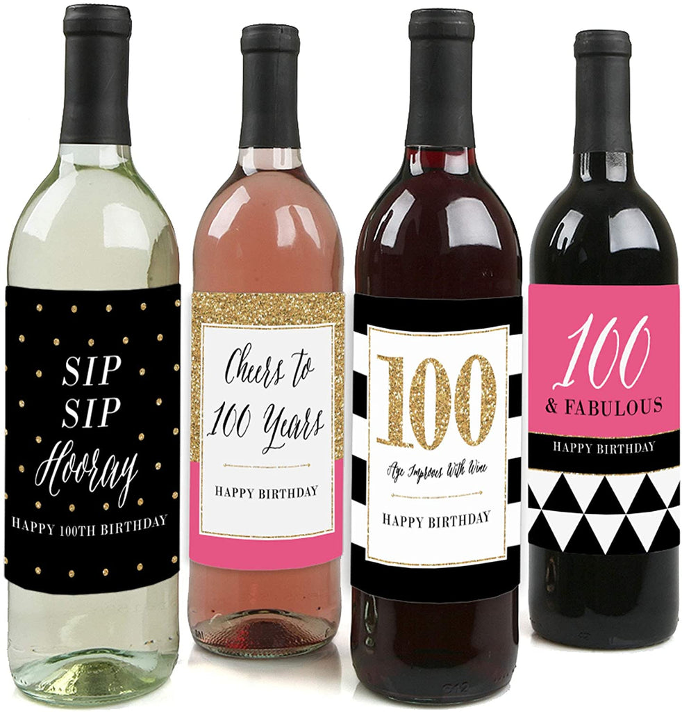 Chic 100th Birthday - Pink, Black and Gold - Birthday Gift For Women - Wine Bottle Label Stickers - Set of 4