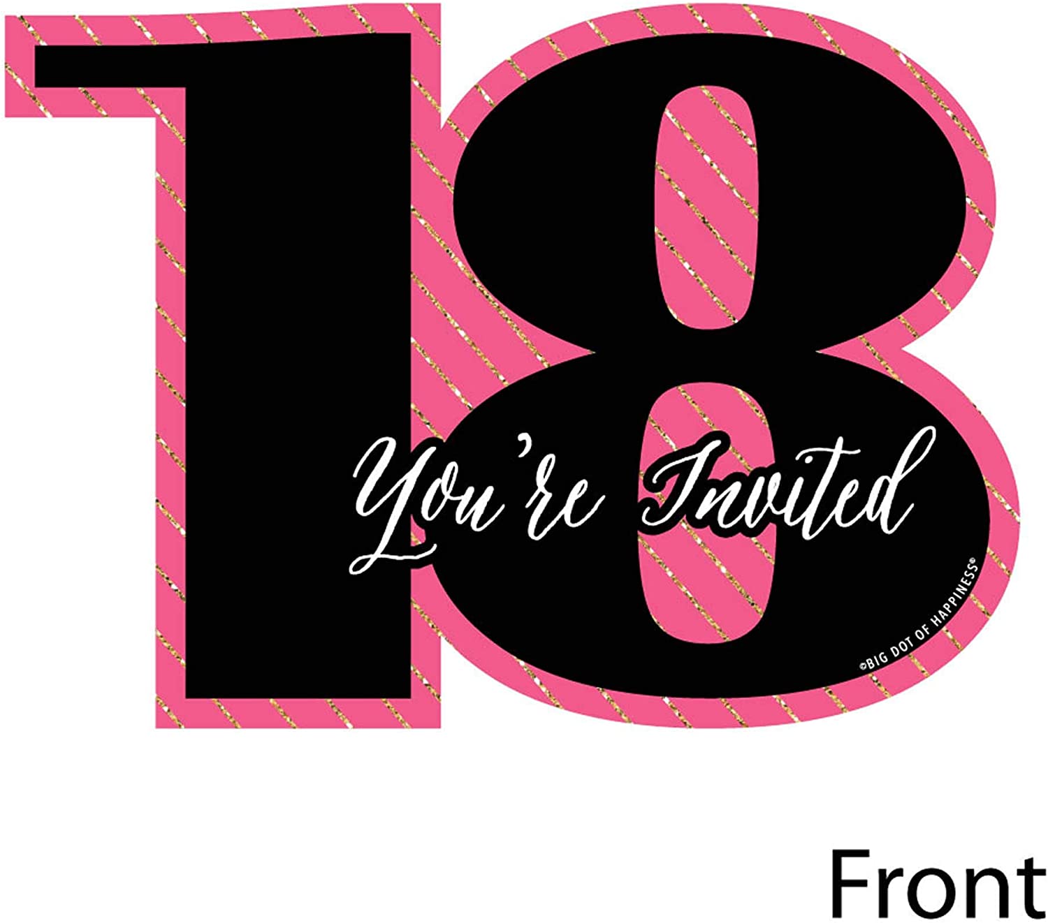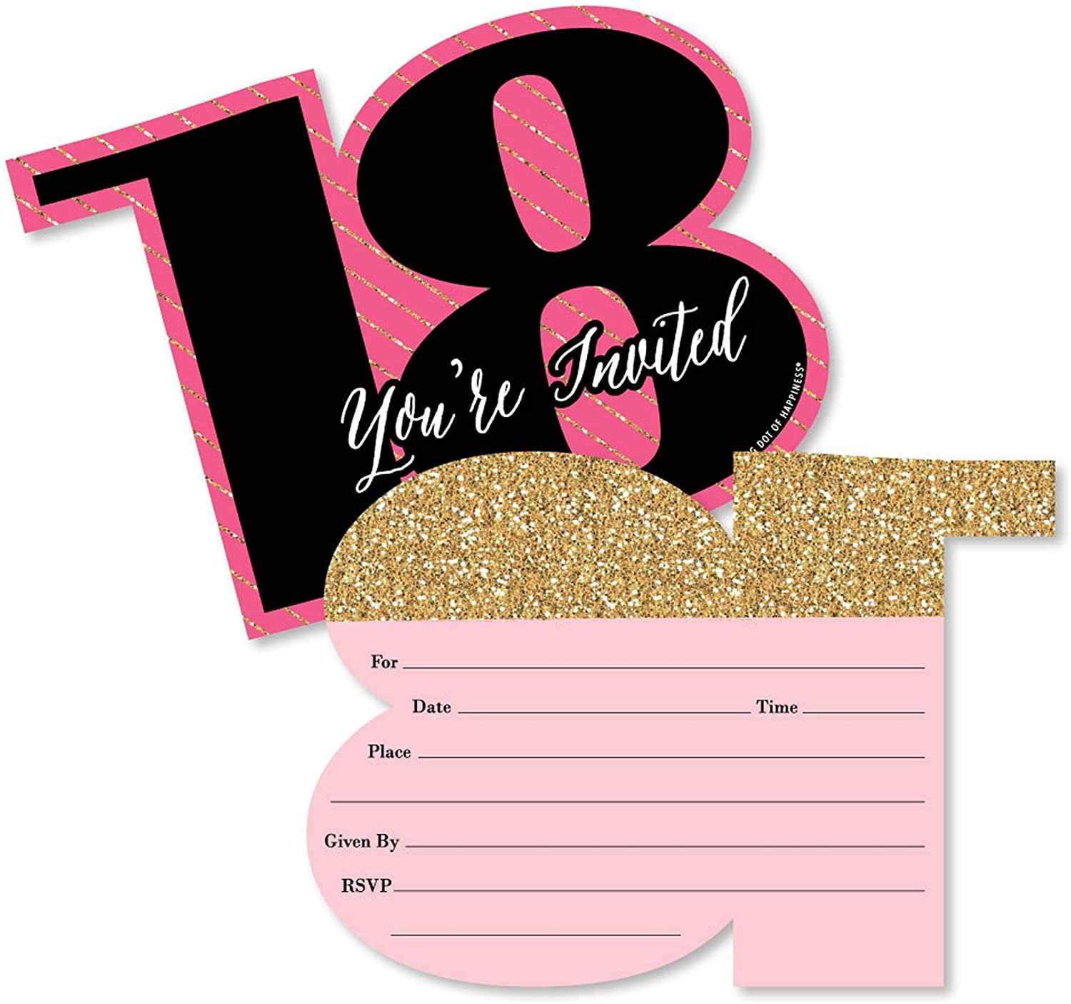 • Chic 18th Birthday Fill-In the Blank Invitation Set INCLUDES 12 eighteen party invitations and 12 premium white envelopes. Chic 18th Birthday fill-in invitations are perfect for any event. The pink and gold theme are great for a birthday party.