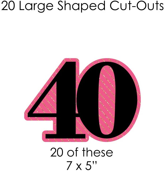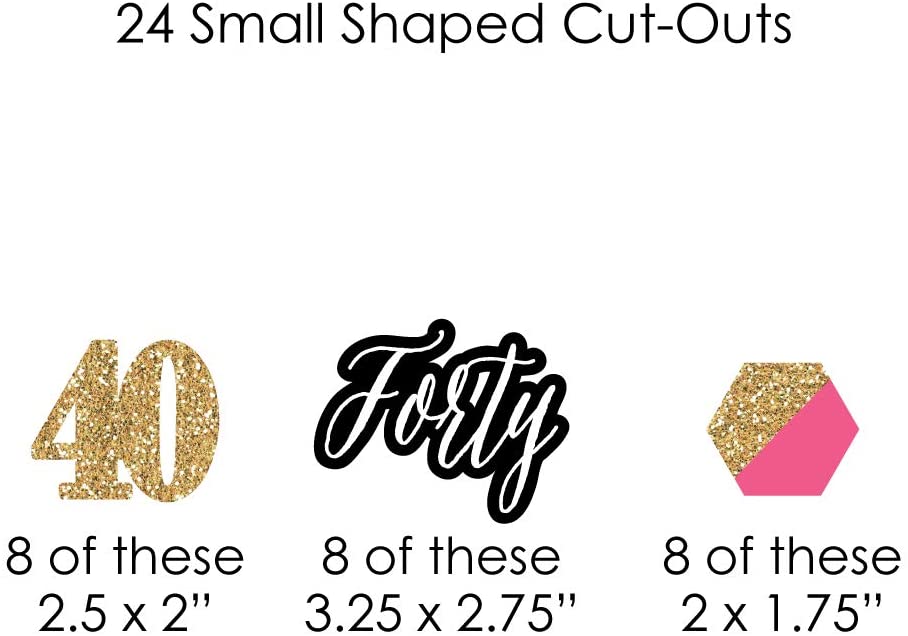 • DIY PARTY SUPPLIES: Chic 40th Birthday - Pink Black and Gold small paper shaped cut-out SIZE 8 Gold 40 (2.5 inches x 2 inches), 8 Forty (3.25 inches x 2.75 inches), 8 Hexagon (2 inches x 1.75 inches). Chic 40th Birthday - Pink Black and Gold large paper shaped cut-outs SIZE 20 40 (7 inches x 5 inches).