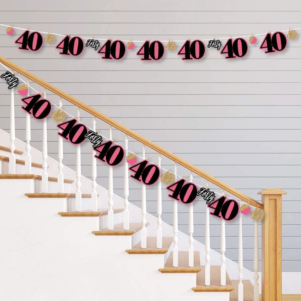 • EASY PARTY DECOR: Style any birthday party with Chic 40th Birthday - Pink Black and Gold clothespin garland banner. Before hanging, plan out your desired pattern by alternating in sizes. Using a miniature clothespin, clip shapes on the included cord. Hang finished DIY garland banner at the entrance of your party, over mantelpiece, along buffet tables. After the party, reuse the clothespins and cord to hang event photos as a fun keepsake.