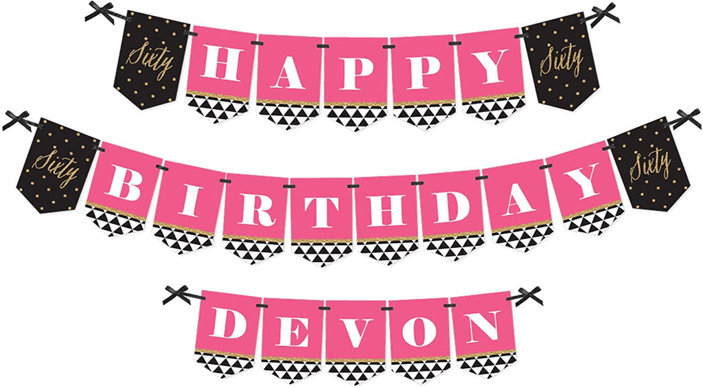 Custom Chic 60th Birthday - Pink, Black & Gold - Personalized Birthday Party Bunting Banner & Decoration - Happy Birthday Custom Name Banner