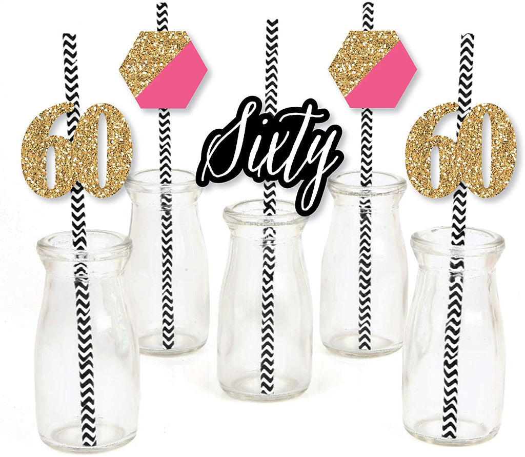 Chic 60th Birthday - Pink, Black and Gold - Paper Straw Decor - Birthday Party Striped Decorative Straws - Set of 24