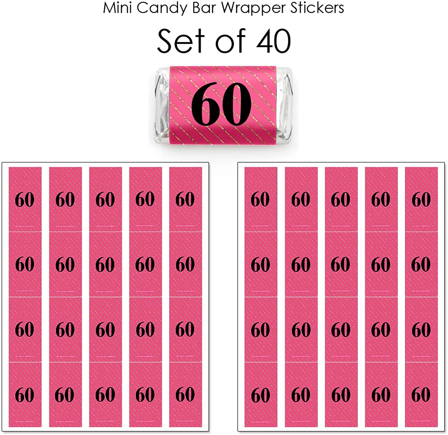 Chic 60th Birthday - Pink, Black and Gold - Mini Candy Bar Wrapper Stickers - Birthday Party Small Favors - 40 Count is backordered and will ship as soon as it is back in stock.