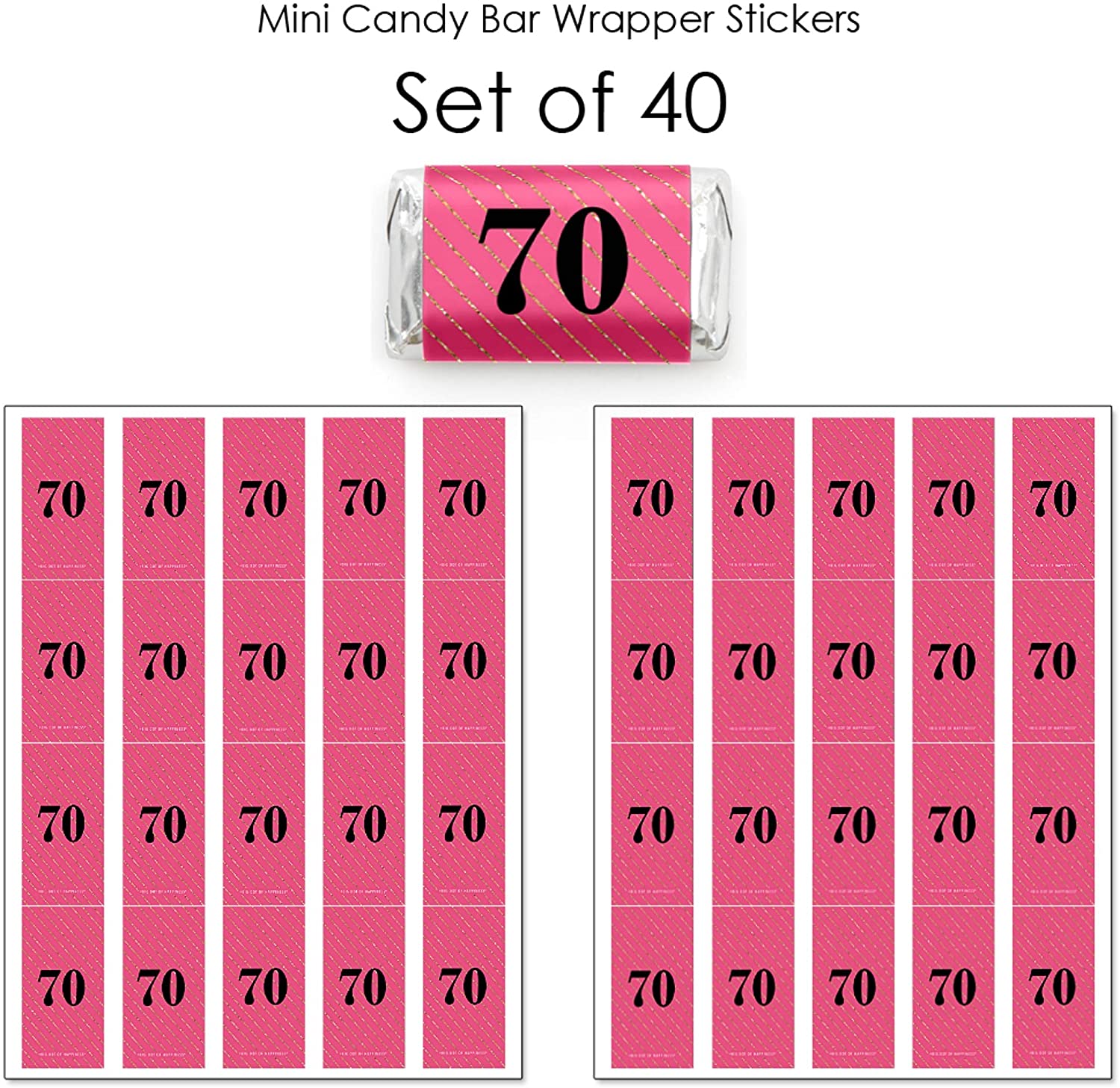 Chic 70th Birthday - Pink, Black and Gold - Mini Candy Bar Wrapper Stickers - Birthday Party Small Favors - 40 Count is backordered and will ship as soon as it is back in stock.