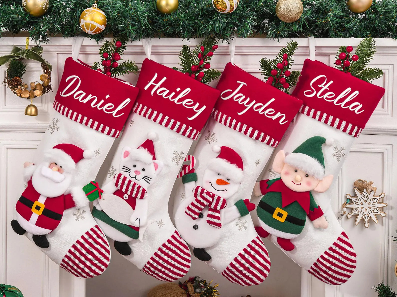 🏡 Customizable: Each stocking can be personalized with a name. Hang individually by the fireplace to create a festive atmosphere, or hang a set on the Christmas tree to create a personalized gift bag.