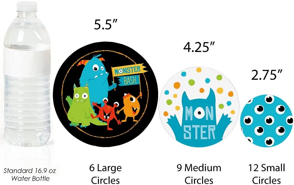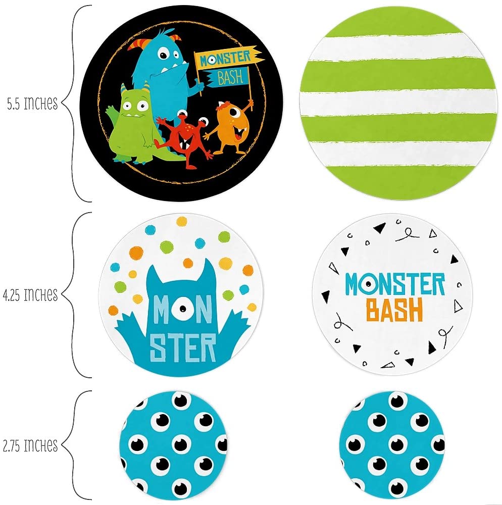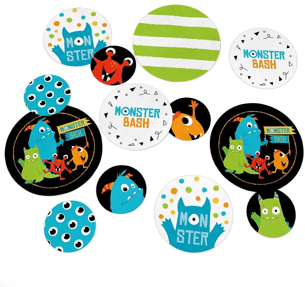 • Monster Bash giant circle confetti SIZE 5.5 inches large circles, six qty; 4.25 inches medium circles, nine qty; and 2.75 inches small circles, twelve qty. The unique design and large size makes these silly monster party decorations an impressive addition to any baby shower or birthday party.