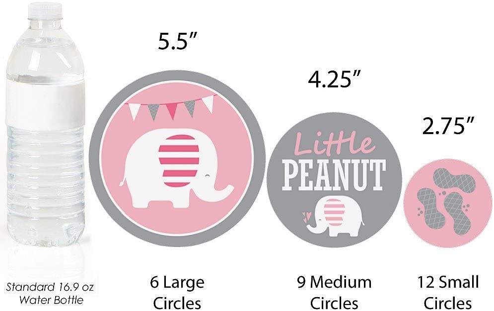 • Pink Elephant giant circle confetti SIZE 5.5 inches large circles, six qty; 4.25 inches medium circles, nine qty; and 2.75 inches small circles, twelve qty. The unique design and large size makes these elephant girl party decorations an impressive addition to any baby shower or birthday party.