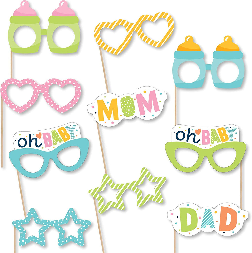 Colorful Baby Shower Glasses - Paper Card Stock Gender Neutral Party Photo Booth Props Kit - 10 Count