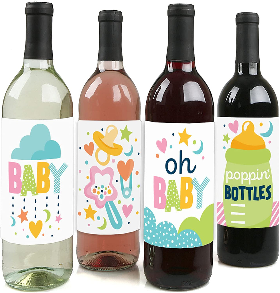 Colorful Baby Shower - Gender Neutral Party Decorations for Women and Men - Wine Bottle Label Stickers - Set of 4