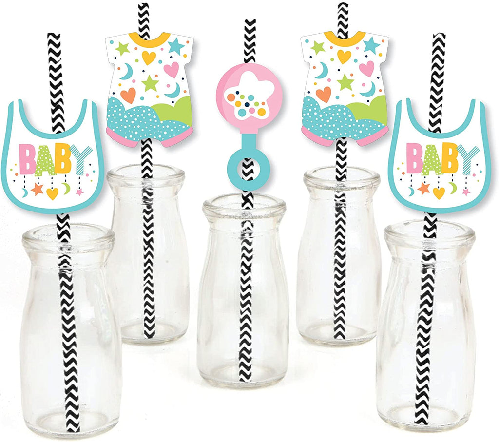 Colorful Baby Shower - Paper Straw Decor - Gender Neutral Party Striped Decorative Straws - Set of 24